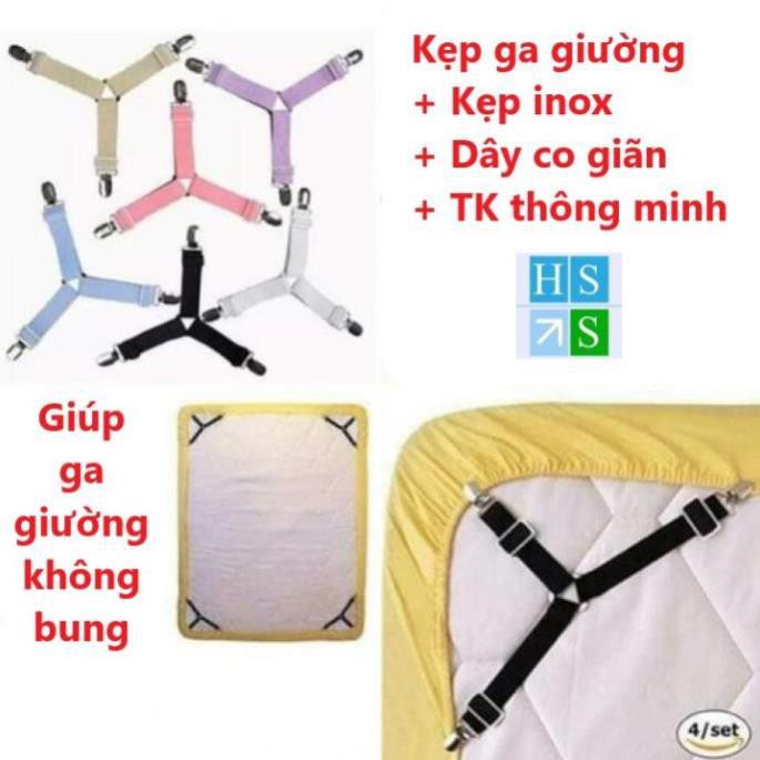 Bộ 4 Kẹp ga trải giường chống xê dịch, cố định và giữ phẳng drap ga phủ giường, dây co dãn tốt đầu kẹp thép không gỉ