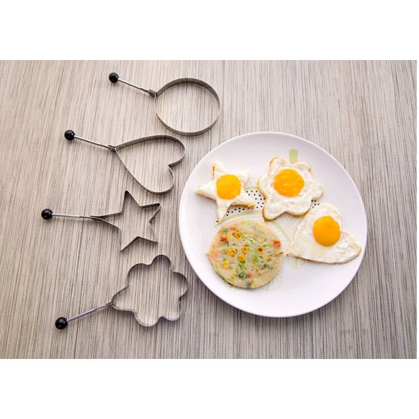 Bộ 4 khuôn chiên trứng làm bánh tạo hìnhVới bộ 4 khuôn chiên trứng làm bánh tạo hình, món trứng ốp của bạn sẽ tuyệt đẹp. Có các hình trái tim, hình tròn, hình bông hoa, hình ngôi sao. Sử dụng rất đơn giản, bạn chỉ cần cho khuôn lên chảo, cho dầu vào, rồi đập trứng vô là xong. Cùng 1 chiếc chảo, bạn có thể ốp được 4 quả trứng cùng lúc. Thật tiện phải ko nào?!