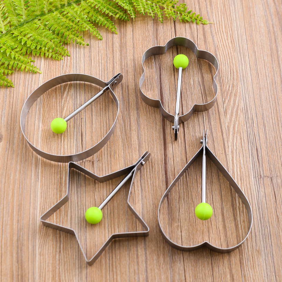 Với bộ 4 khuôn chiên trứng làm bánh tạo hình, món trứng ốp của bạn sẽ tuyệt đẹp. Có các hình trái tim, hình tròn, hình bông hoa, hình ngôi sao. Sử dụng rất đơn giản, bạn chỉ cần cho khuôn lên chảo, cho dầu vào, rồi đập trứng vô là xong. Cùng 1 chiếc chảo, bạn có thể ốp được 4 quả trứng cùng lúc. Thật tiện phải ko nào?!