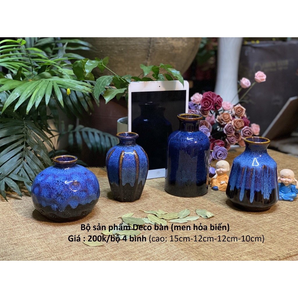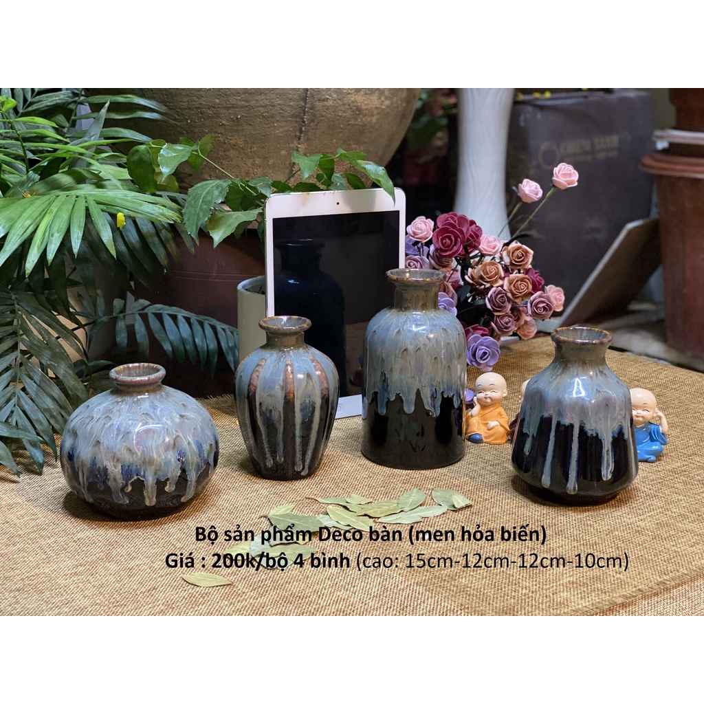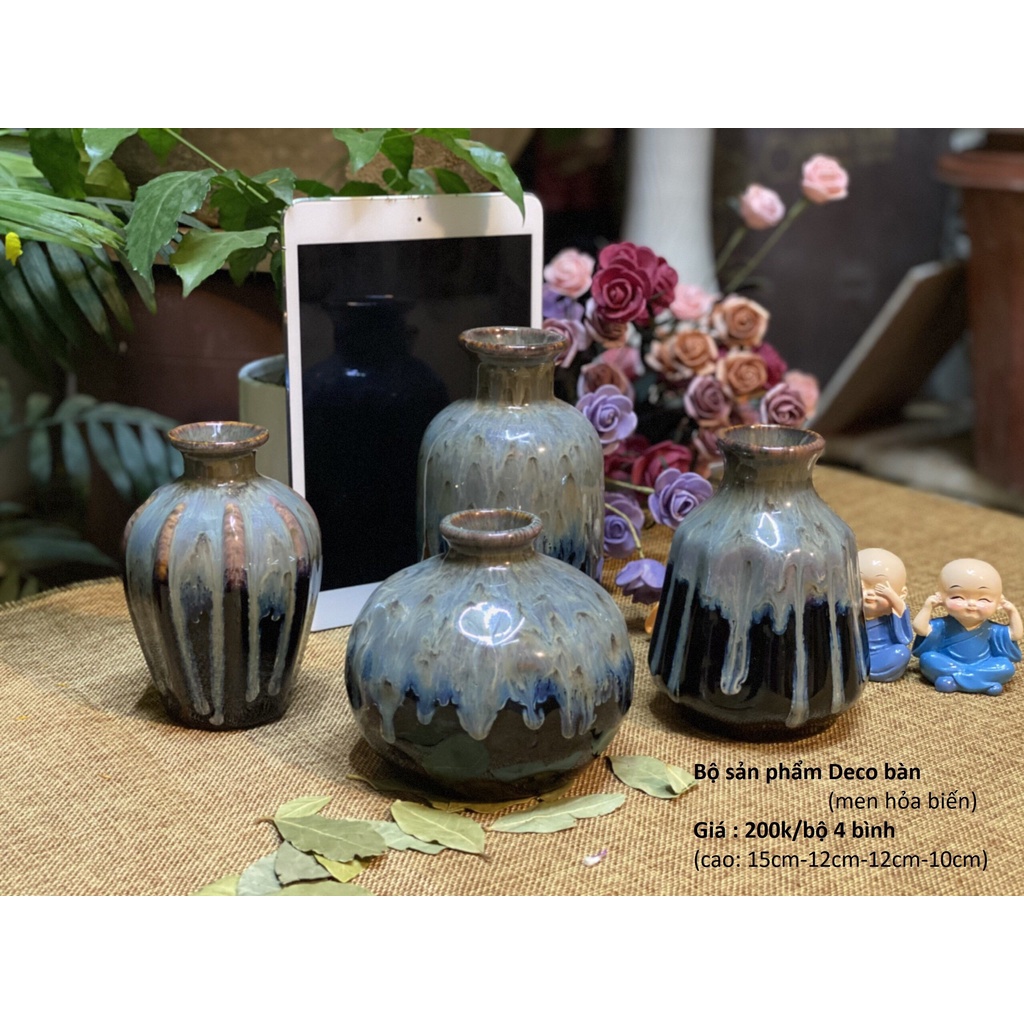 -Tên sản phẩm : Bộ 4 bình decor cắm bàn - men hỏa biến-Chiều cao bình : 15cm - 12cm - 12cm - 10cm