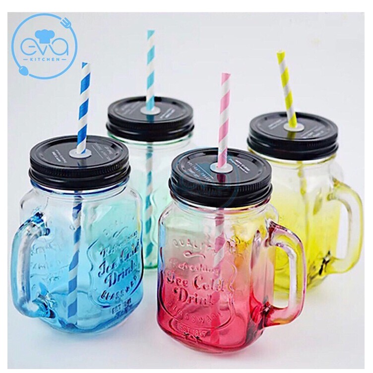 Giới thiệu Bộ 4 Ly Quai Thuỷ Tinh In Hình Trái Cây 450 Ml Nắp Màu Ngẫu Nhiên