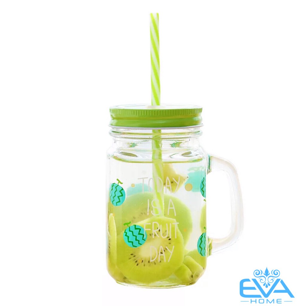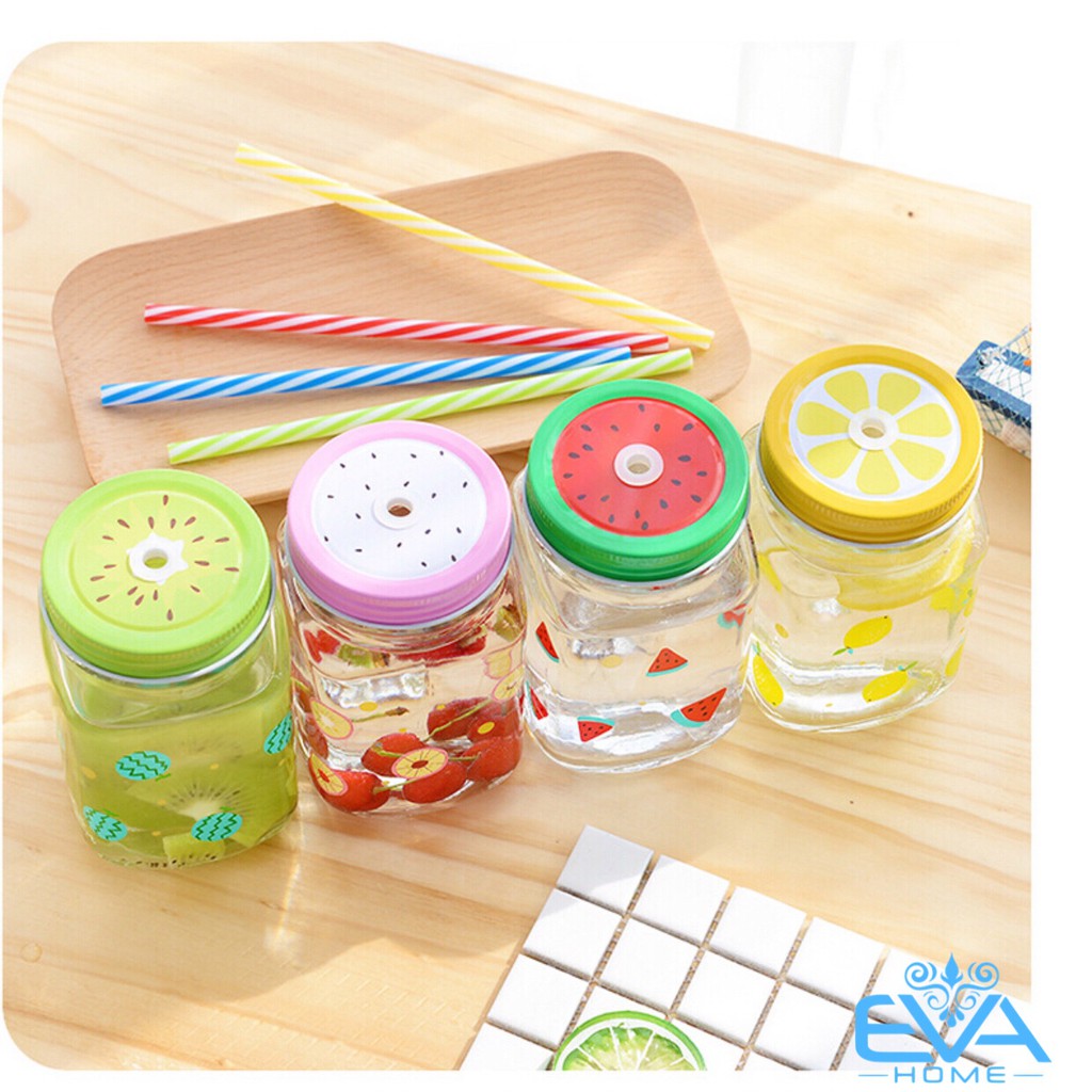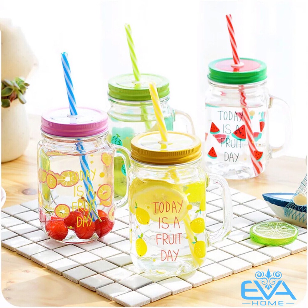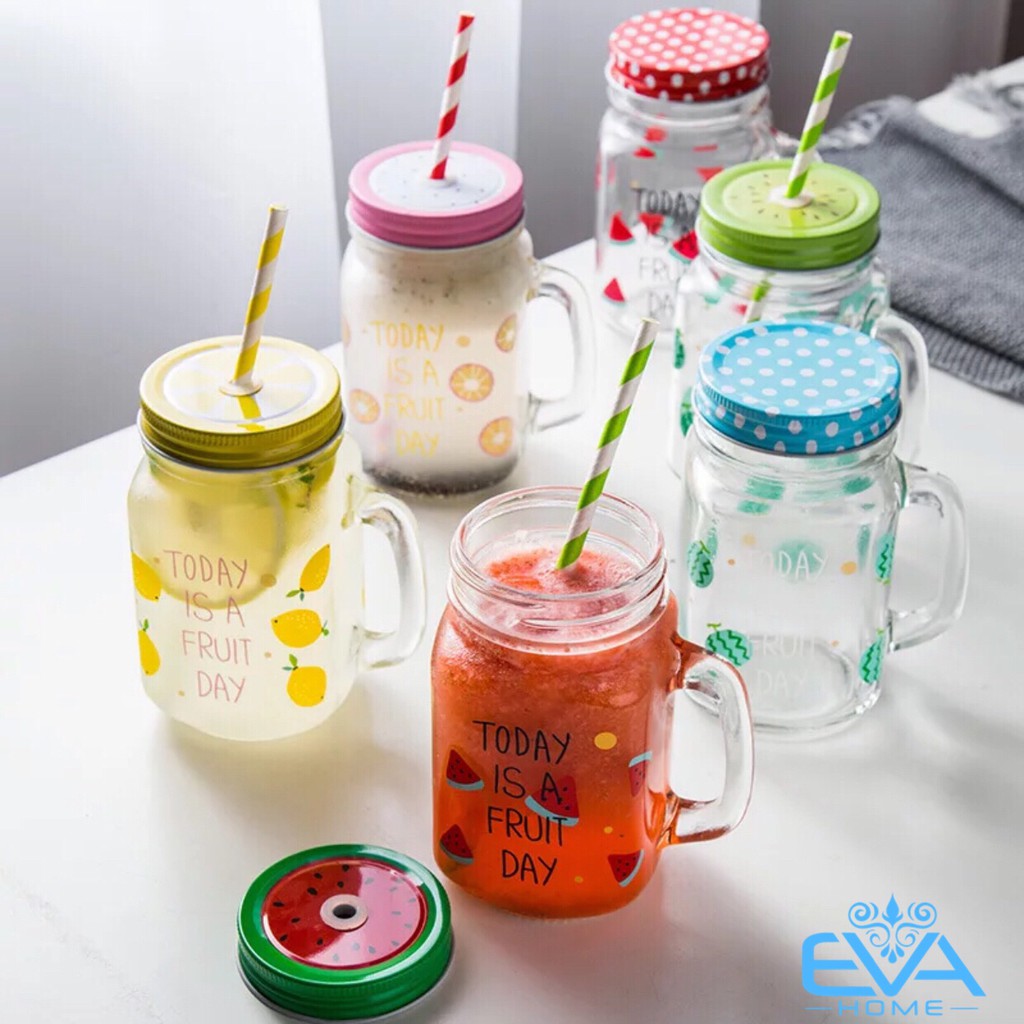 Bộ 4 Ly Quai Thuỷ Tinh In Hình Trái Cây 450 Ml Nắp Màu Ngẫu Nhiên