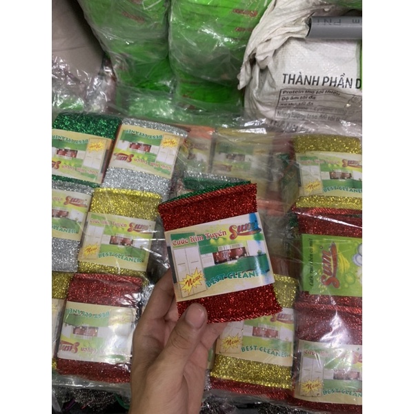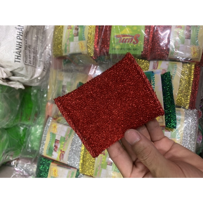 - Miếng rửa chén kim tuyến đươc làm từ chất liệu sợi tổng hợp, dây kim tuyến và kết hợp lõi mút