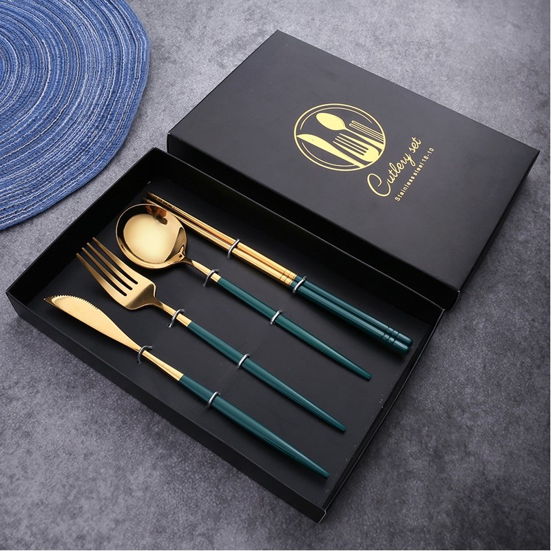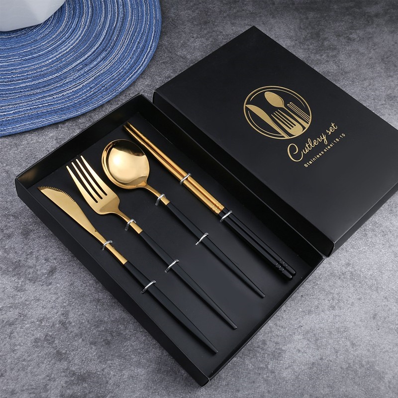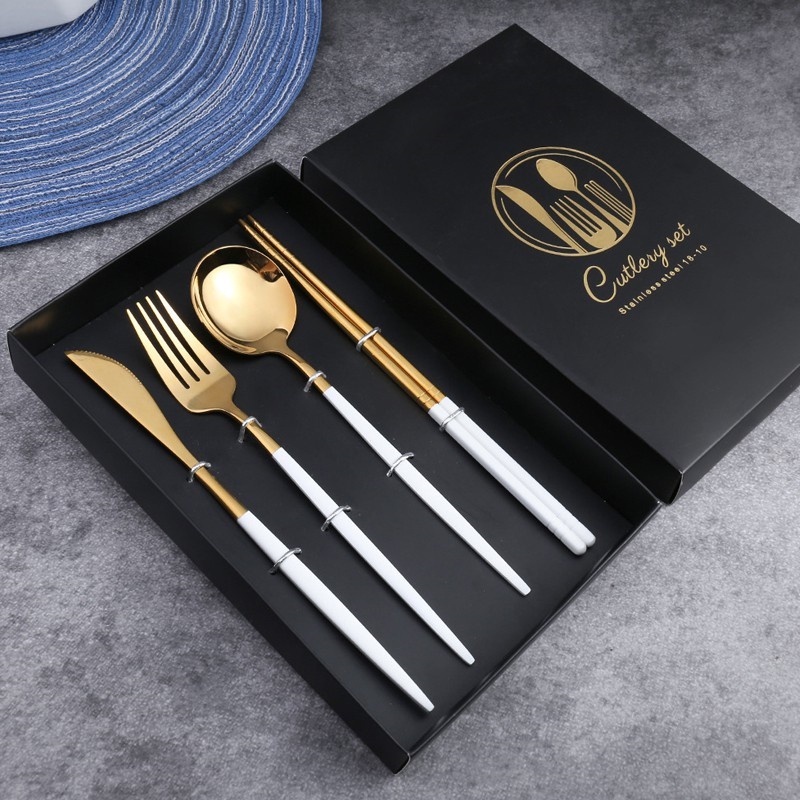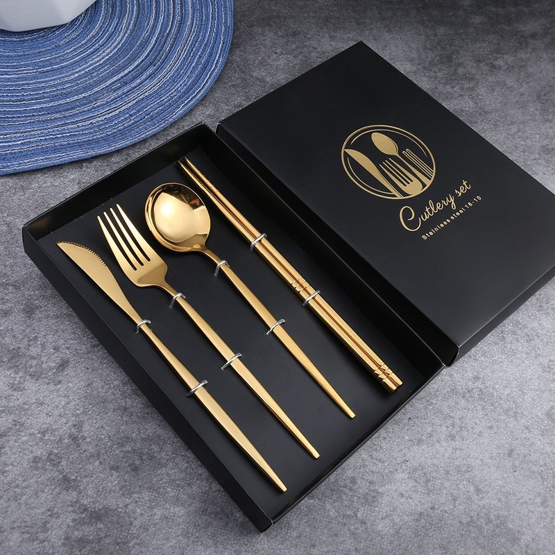 Bộ 4 Món Dao Nĩa Muỗng Đũa inox 304 Mạ Vàng Kèm Hộp- Bộ đũa muỗng văn phòng - Đồ gia dụng - Tiện ích gia đình