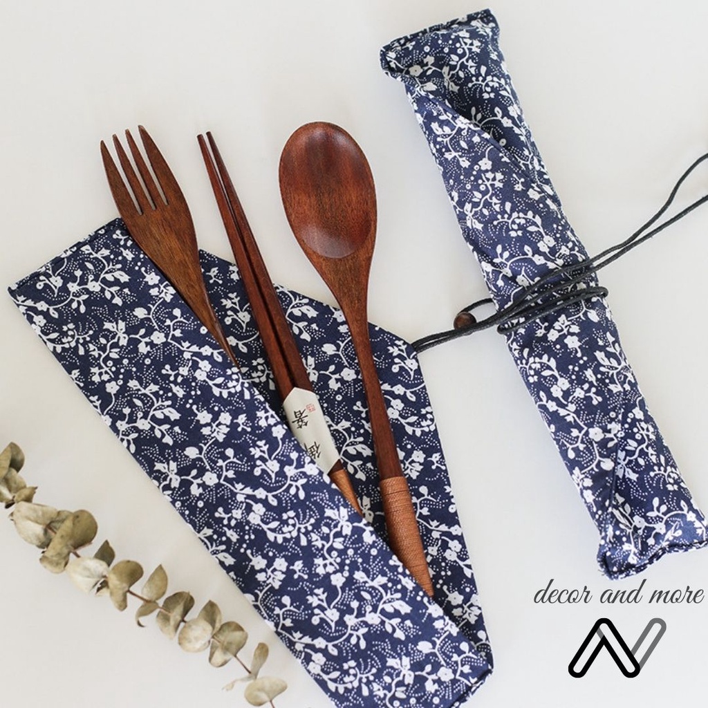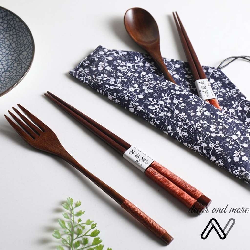 Bộ 4 món đũa, thìa, dĩa gỗ Nhật Bản, set dụng cụ ăn cá nhân