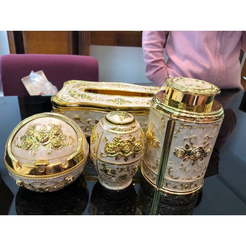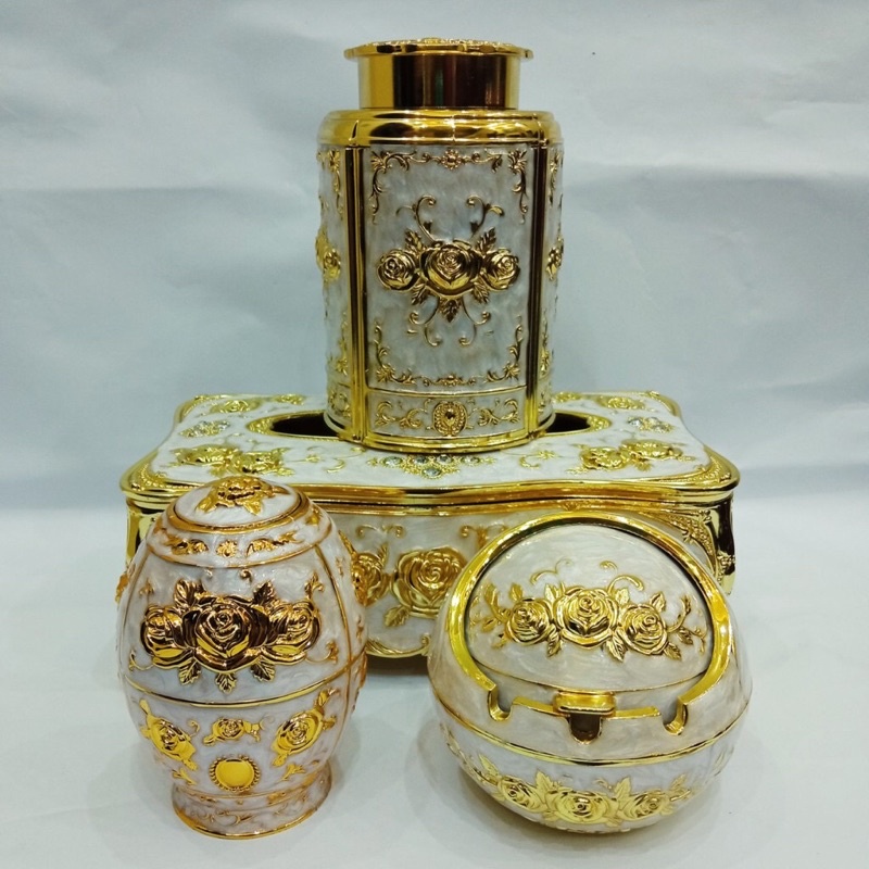 Bộ 4 món Hoàng Gia, hộp trà, lọ tăm, khay đựng giấy, gạt tàn, chất liệu hợp kim, màu vàng/xanh - Hoa văn tinh tế