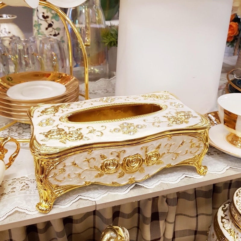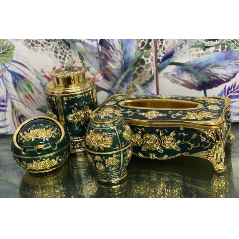 Nhà cửa & Đời sống > Sắp xếp nhà cửa > Hộp khăn giấy || Bộ 4 món Hoàng Gia, hộp trà, lọ tăm, khay đựng giấy, gạt tàn, chất liệu hợp kim, màu vàng/xanh - Hoa văn tinh tếCòn hàng