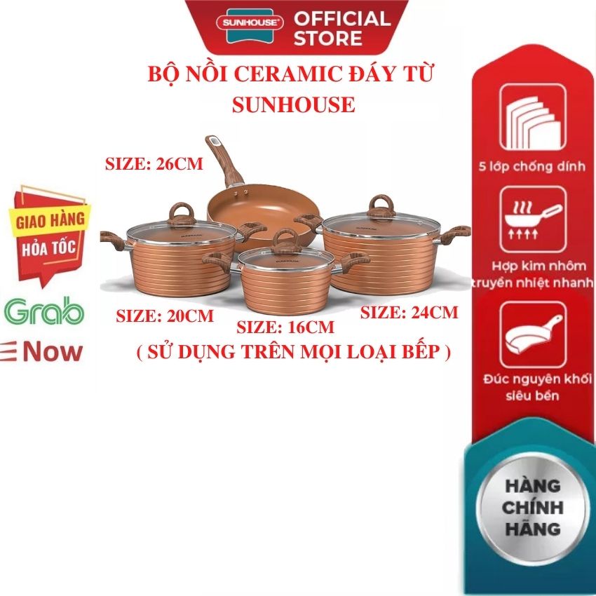 Bộ 4 Nồi Ceramic SUNHOUSE Kèm Chảo Chống Dính 16 20 24 26CM Nồi Bếp Từ Mới 100% Bảo Hành Chính Hãng Toàn Quốc