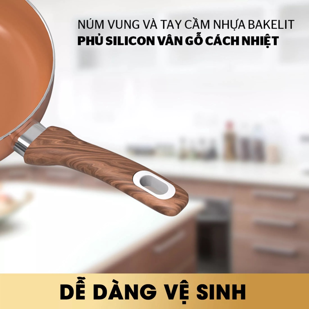 - Bộ nồi, chảo với màu vàng đồng bắt mắt, làm sáng không gian bếp. Bên cạnh đó các sản phẩm được phủ sứ chống dính bên trong và sơn chịu nhiệt bên ngoài chống bám bụi, dễ dàng vệ sinh.