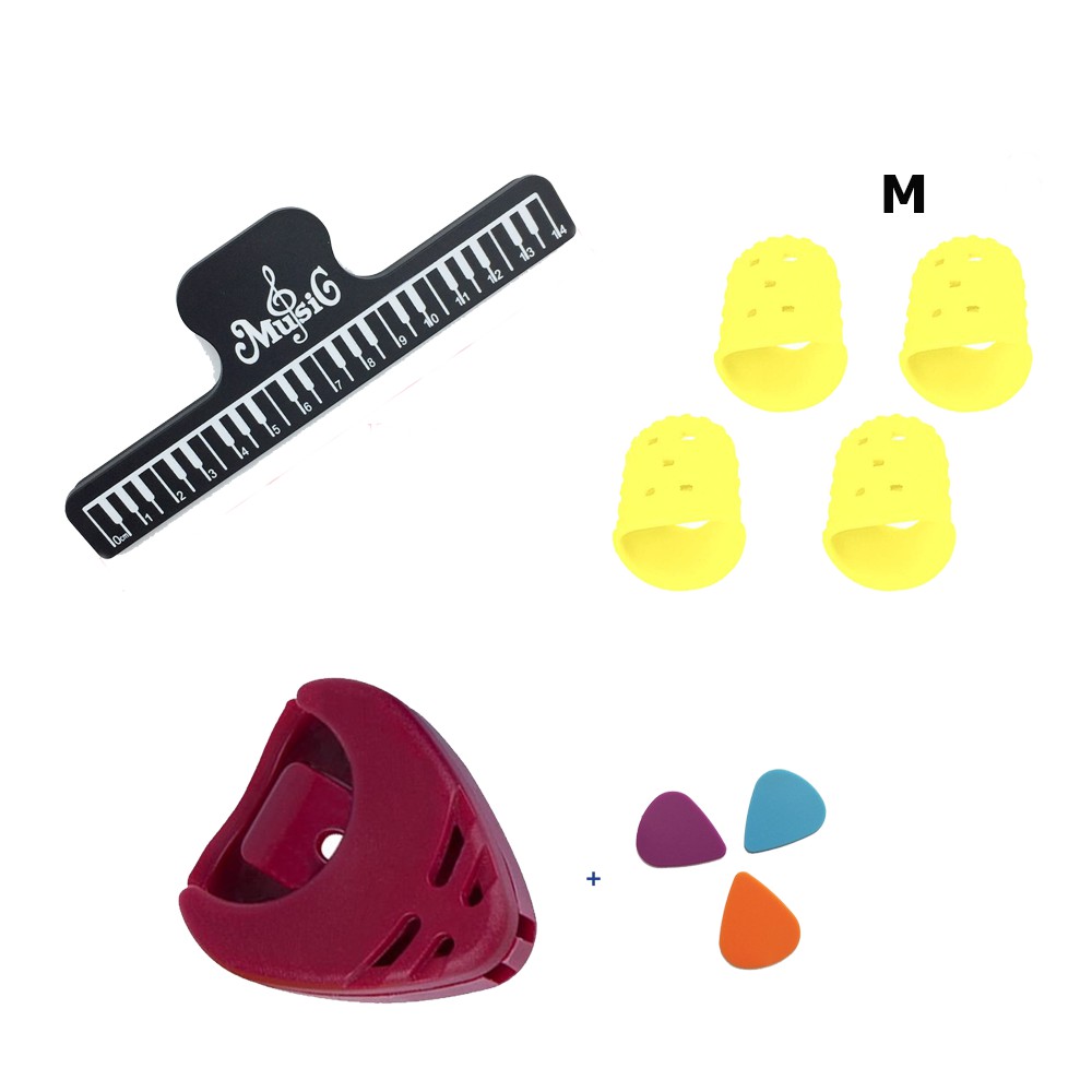 Bộ 4 phụ kiện guitar CBKBN ( Kẹp bản nhạc, Bọc ngón tay silicon, Hộp đựng pick (pick holder) và 3 pick gảy )