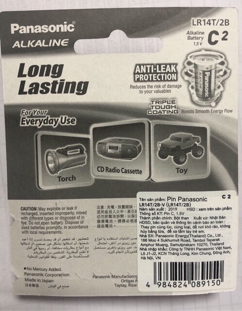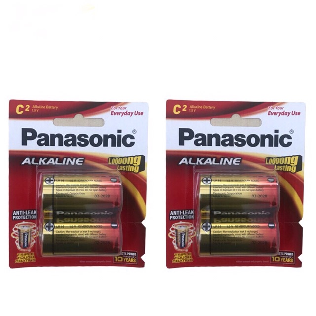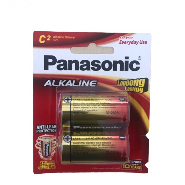 Pin Trung C Alkaline Panasonic Mã sản phẩm LR14T/2B Panasonic được sản xuất từ chất liệu kiềm giúp tăng thời gian sử dụng lên 6 lần đồng thời tăng công suất vượt trội cho tuổi thọ và độ bền cao, phù hợp với những thiết bị tiêu tốn nhiều năng lượng như các thiết bị y tế và đồng hồ, đồ chơi trẻ em , Bếp gas âm ...SẢN XUẤT TẠI NHẬT BẢN