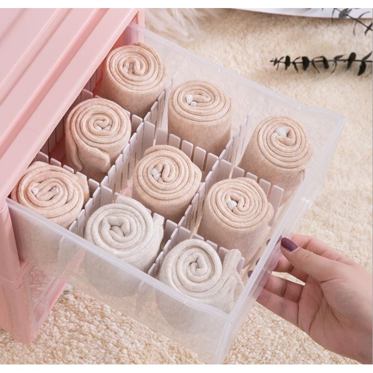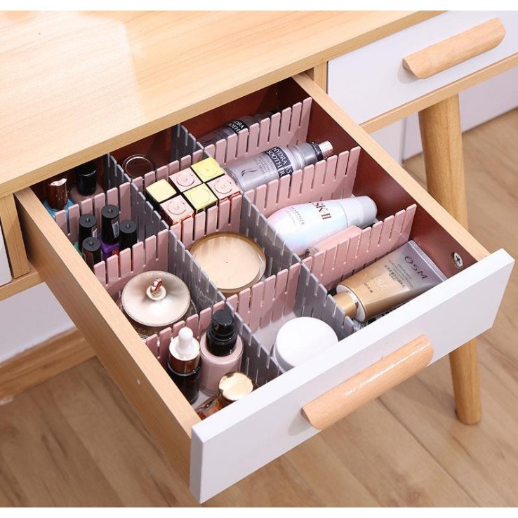Gồm nhiều khe gắn, độ dẻo cao cho bạn tự do sáng tạo thành những chiếc ngăn chứa độc đáo hoặc gắn thành 1 chiếc khay để bàn tiẹn lợi dùng để đựng cà vạt, đồ lót, mỹ phẩm, dụng cụ học tập,… trông thật gọn gàng và bắt mắt.