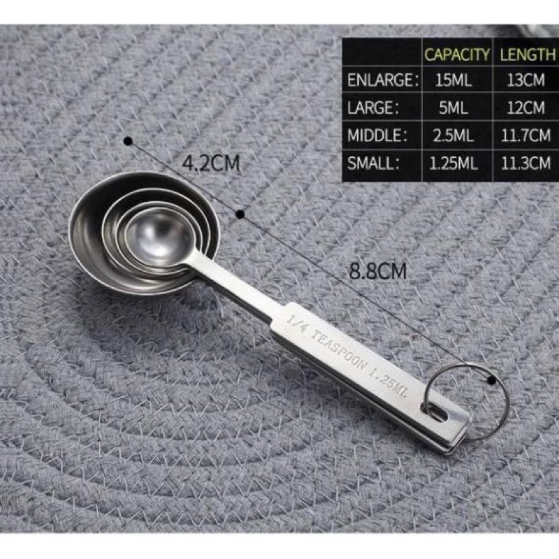 - Sản phẩm gồm 4 chiếc thìa với 4 kích thước khác nhau từ nhỏ đến lớn với 2 hệ đo lường ml và tsp.