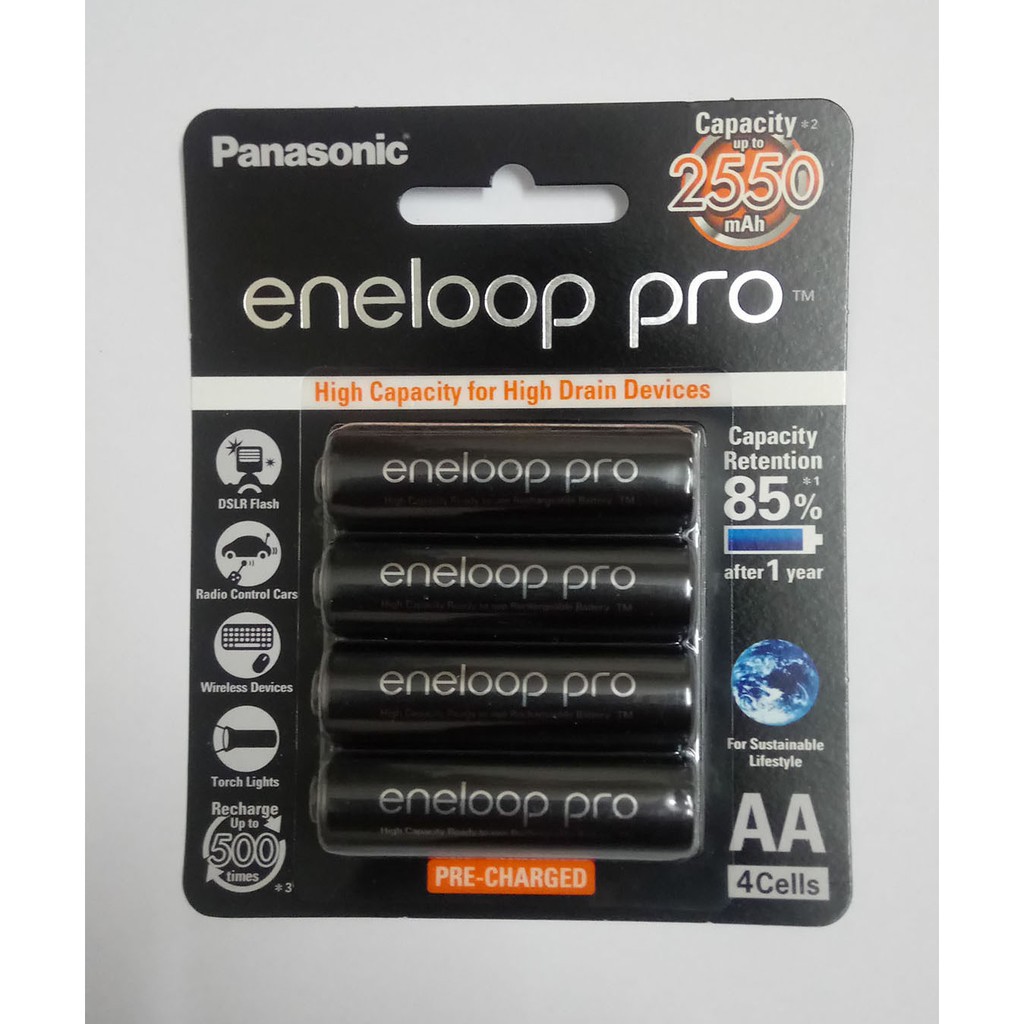 Pin AA sạc Pana Eneloop 2500 mAh new 100%Pin AA Panasonic Eneloop Đen (Đen). THÔNG TIN SẢN PHẨM.GIỚI THIỆU.Bạn luôn cảm thấy thú vị với pin máy ảnh độ xả cực thấp.(low-self-discharge) nhưng không hài lòng với dung lượng? Pin.eneloop XX là giải pháp của bạn..Với dung lượng trung bình lên đến 2500mAh, Pin máy ảnh Eneloop phù.hợp với những thiết bị cần dung lượng pin lớn như máy ảnh. Eneloop.XX cũng mang lại lợi thế của viên pin dùng một lần: đó là dung.lượng cao, được sạc sẵn (pre-charged). Pin có thể sử dụng được ngay.sau khi mua về.Vì độ xả thấp nên pin giữ được 75% năng lượng sau một năm không sửa.dụng. Rất kinh tế và thân thiện với môi trường vì viên pin có thể.sạc lên đến 500 lần. Cứ 3 ngày bạn sạc pin một lần thì tuổi thọ của.pin là 1500 ngày (4 năm) ..TÍNH NĂNG NỔI BẬT.- Pin Sạc Eneloop.- Hãng sản xuất: Panasonic.- Loại: Pin tiểu AA.- Vỉ 4 viên.- Voltage: 1.2V.- Dung lượng: 2500 mAh.- Số lần sạc: 500 lần