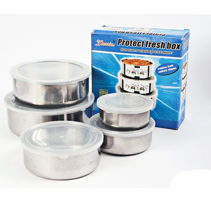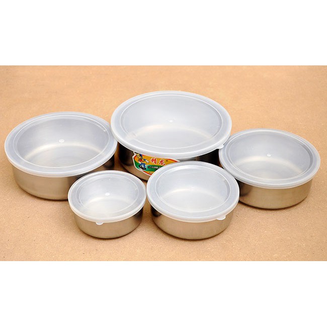 + 5 Bát inox có size lần lượt là 10cm, 12cm, 14cm, 16cm và 18cm cho bạn thoải mái đựng các loại thực phẩm cần thiết để cất vào trong tủ lạnh và dễ dàng tìm kiếm khi cần dùng.