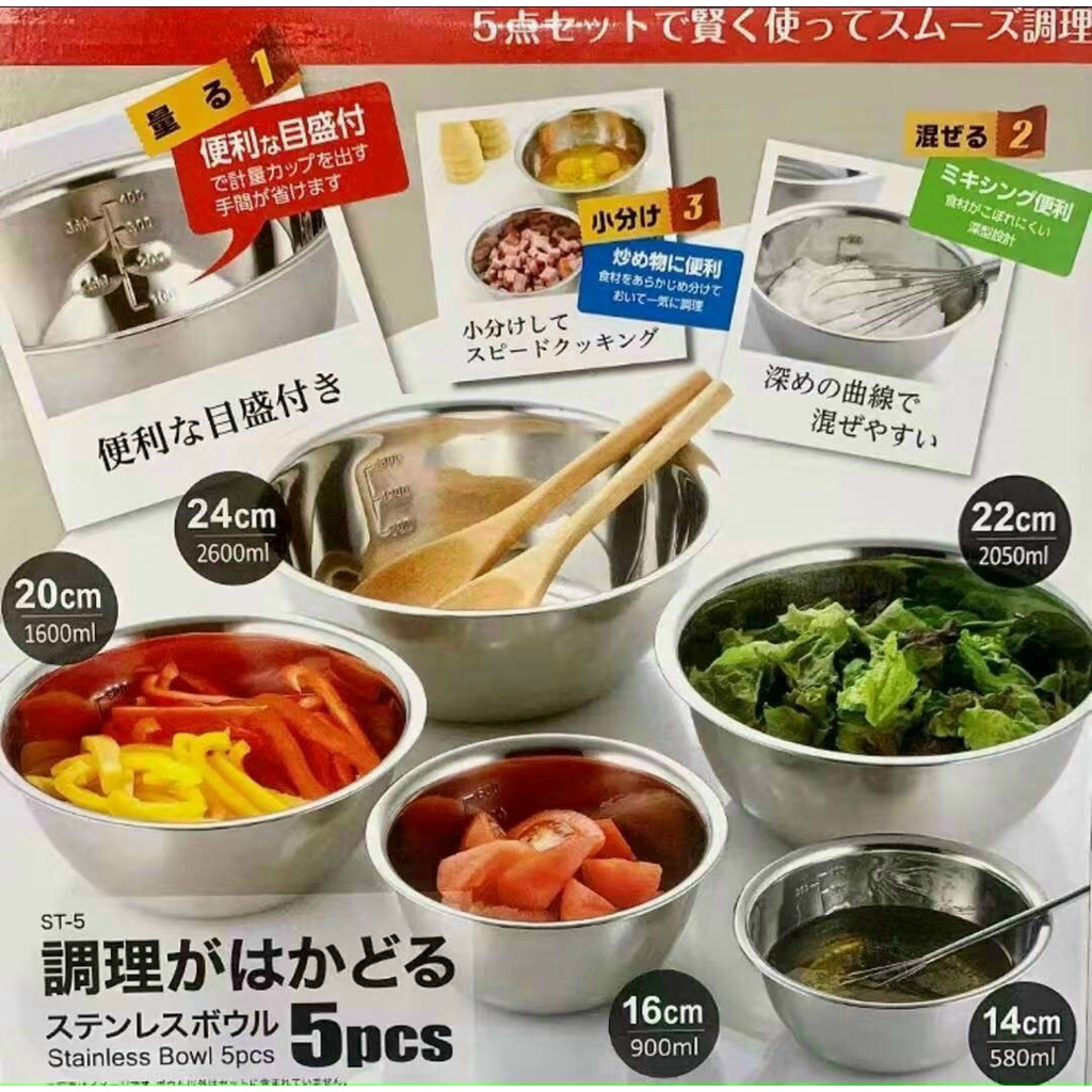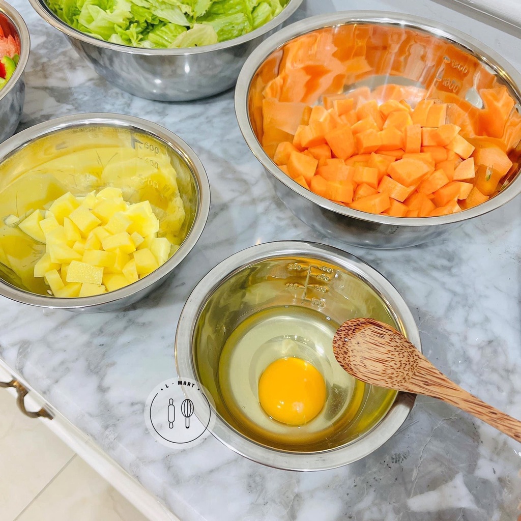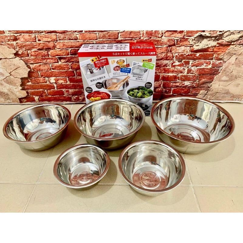 Nhà cửa & Đời sống > Bộ đồ bàn ăn > Tô || Bộ 5 bát inox xuất Nhật, Bộ thau chậu inox hàng có chia vạch làm bánh và thực phẩmCòn hàng