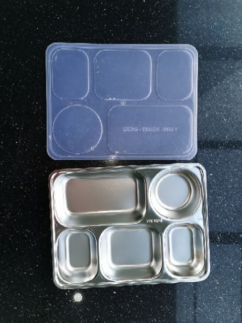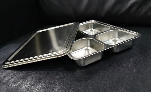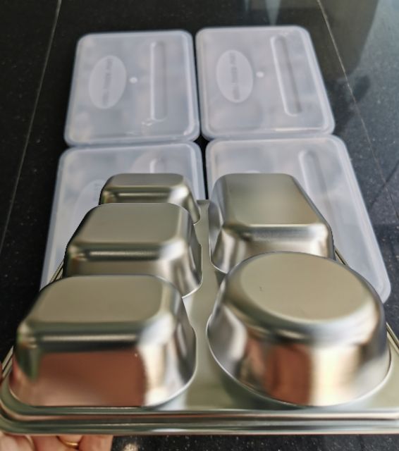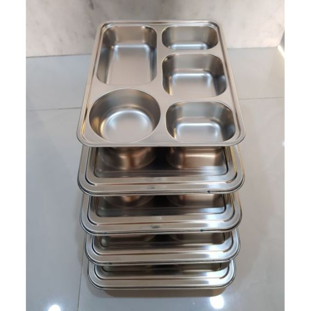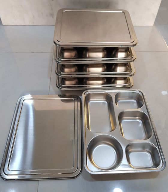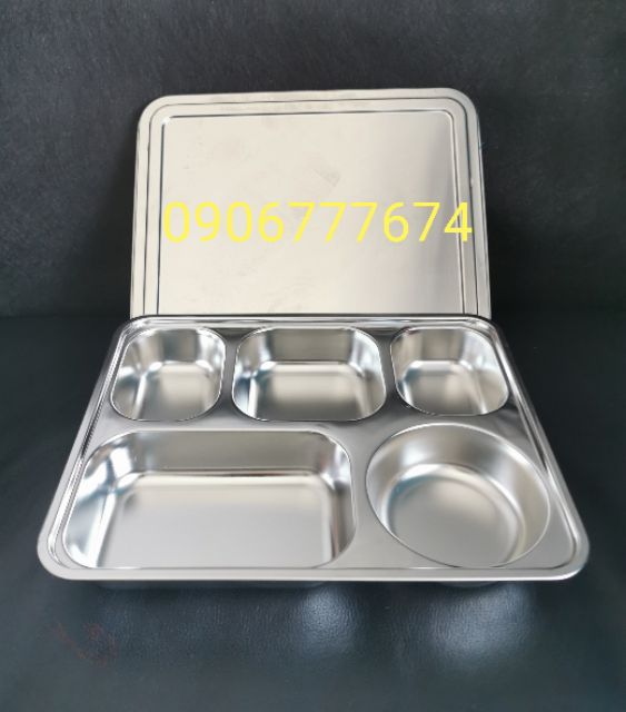 Khay cơm inox 5 ngăn inox kèm nắp inox hoặc nắp nhựa rất đẹp, chuyên dùng cho cơm văn phòng, trường học, hàng không,...