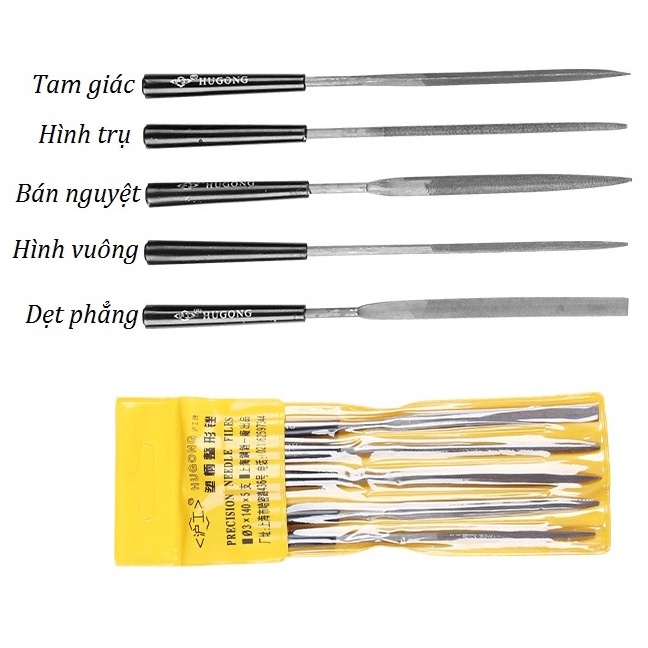 Bộ dũa mài bao gồm 5 loại với các đầu dũa dạng: tròn, bán nguyệt, tam giác, vuông, dẹt phẳng... hỗ trợ mọi chi tiết, chất liệu bạn mong muốn.