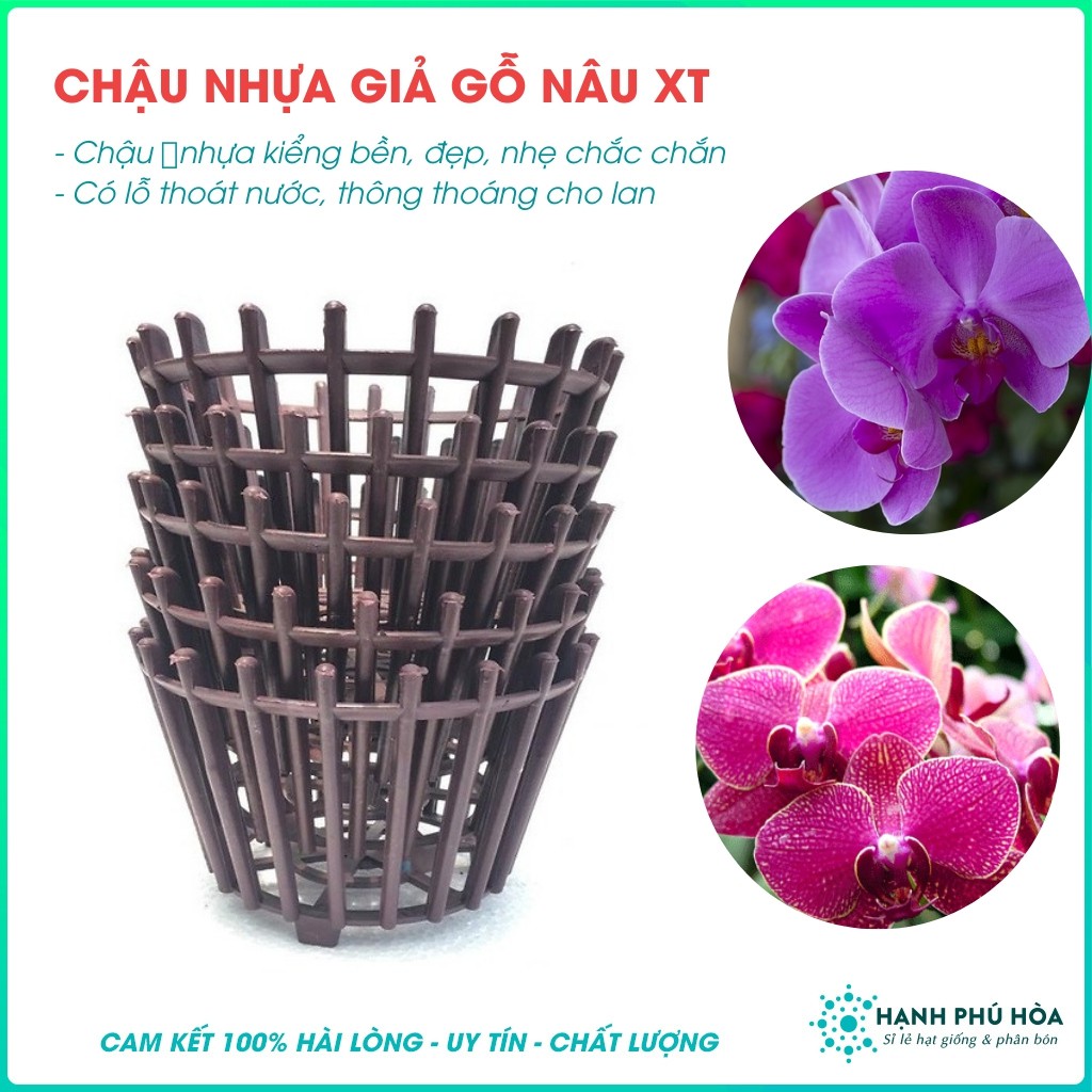 - Chậu nhựa giả gỗ trồng lan được dùng để thay thế chậu trồng lan bằng gỗ. Chậu lan nhựa giả gỗ gọn nhẹ không làm nặng giàn như chậu lan gỗ. Thiết kế đẹp mắt giúp tăng giá trị cho giỏ lan của bạn.