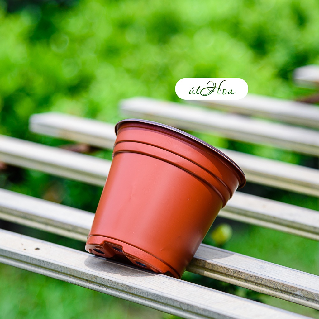 Chậu nhựa nâu- Kích thước: đường kính miệng 12cm, chiều cao 10.6 cm