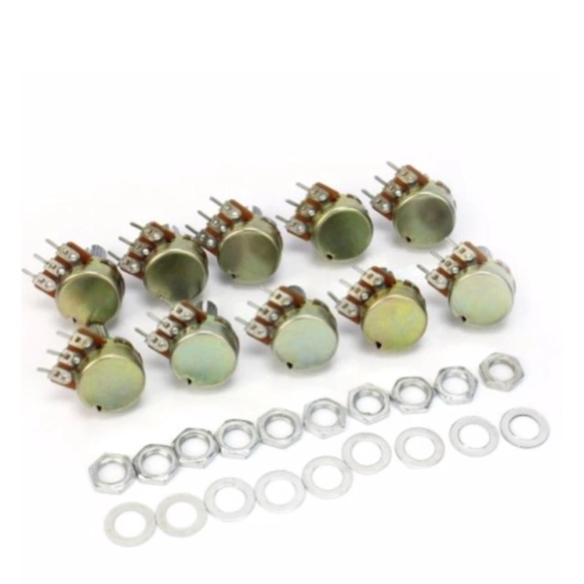 5 con triết áp đơn hoặc kép các số k , dùng điều chỉnh âm lượng to nhỏ cho mạch điện tử . Triết áp đơn dùng cho mono , triết áp kép dùng cho sisterio.Bác nào lấy loại cỡ như nào viết ghi chú giúp em với ạ .
