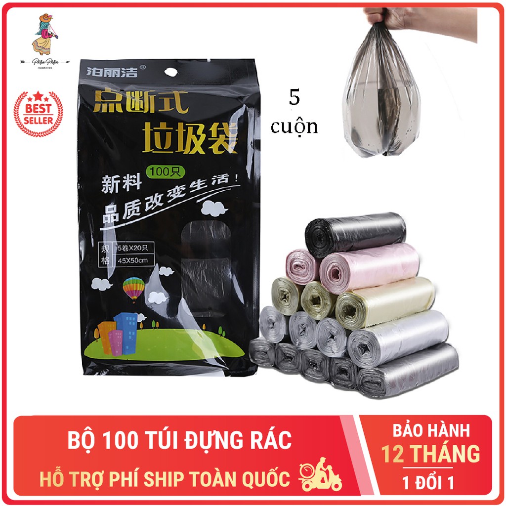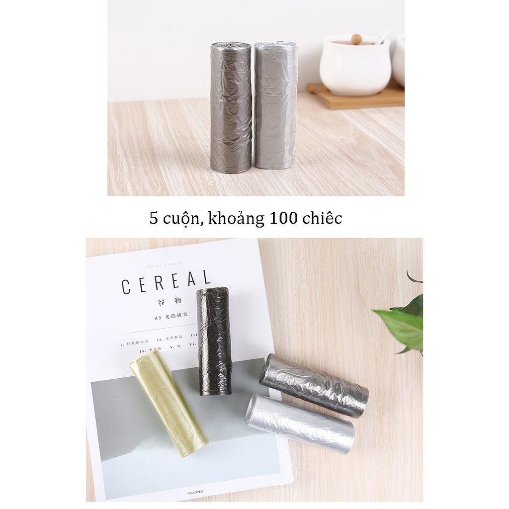 - Gói bao gồm: 5 cuộn túi đựng rác tiện lợi (khoảng 100 chiếc)