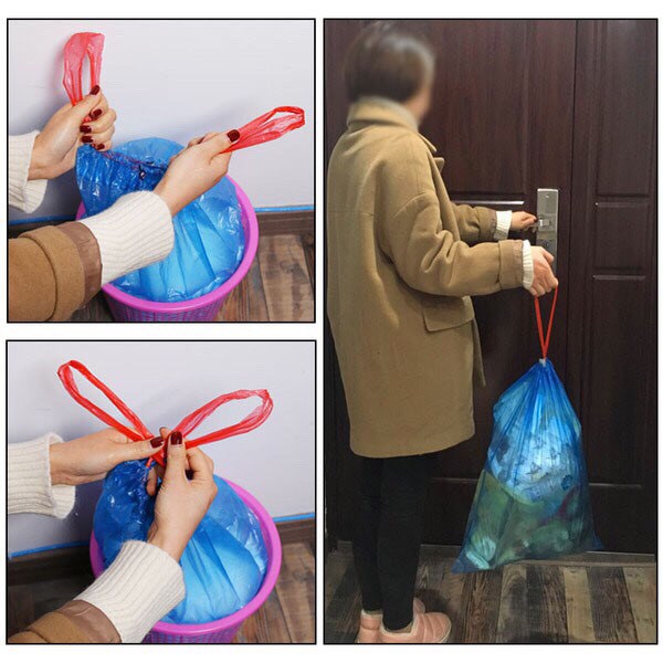 - Cuộn túi đựng rác có dây rút giúp công việc dọn dẹp nhà cửa trở nên nhanh chóng. Các loại rác thải nhỏ như giấy vụn, vỏ bánh kẹo, vỏ trái cây,… sẽ được thu gom nhanh chóng giúp cho không gian sống của bạn sạch sẽ và ngăn nắp.