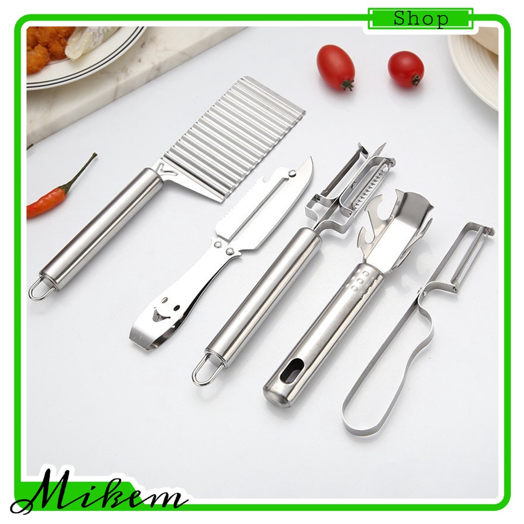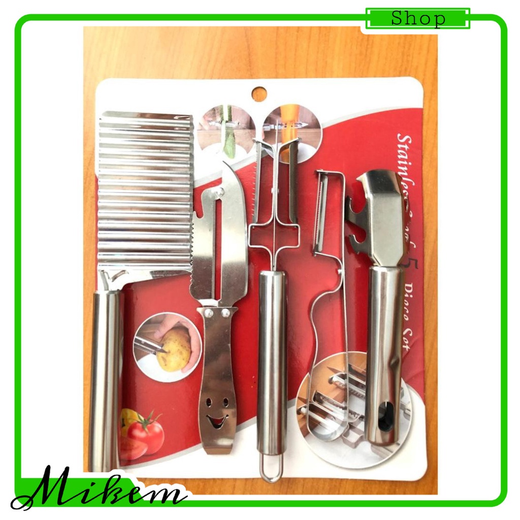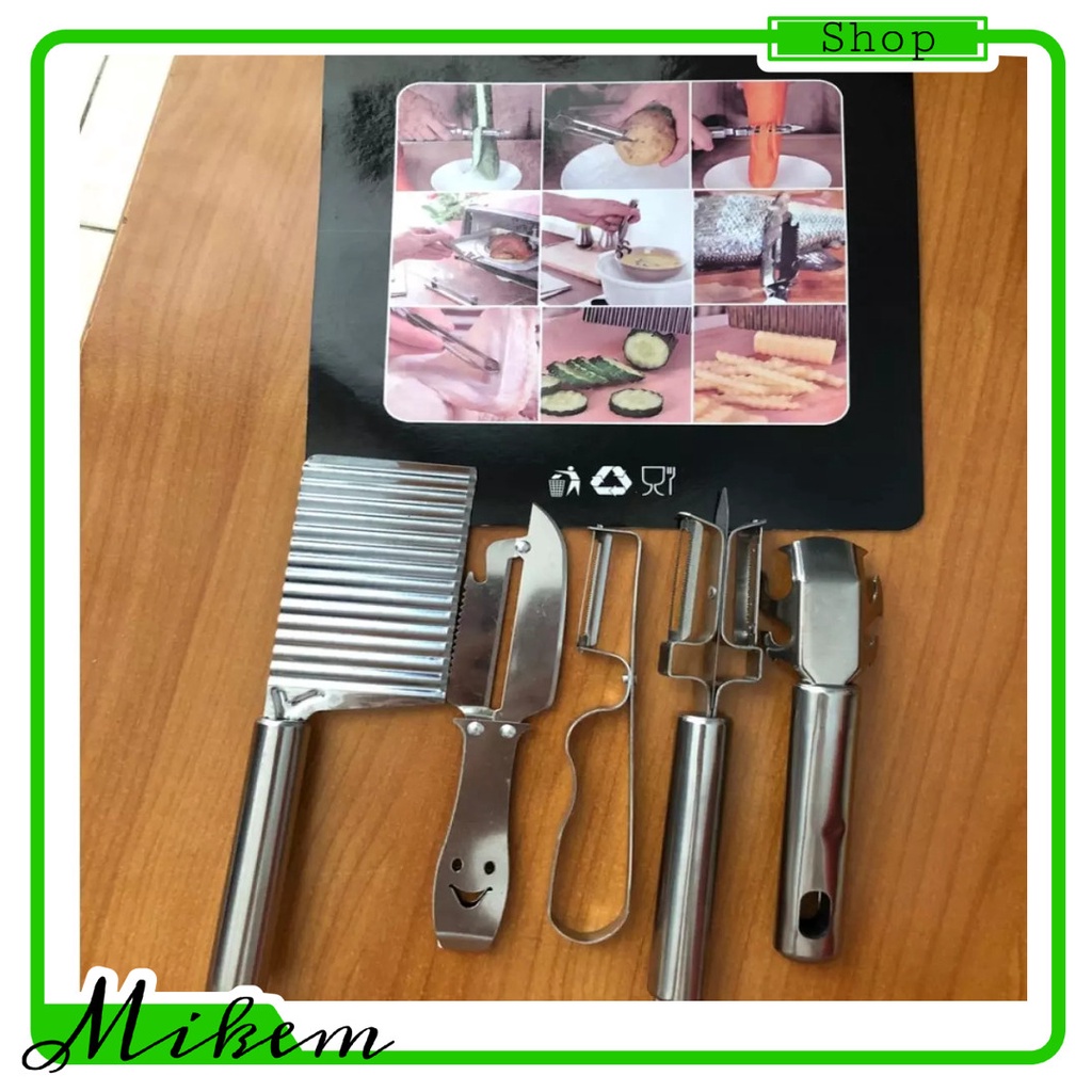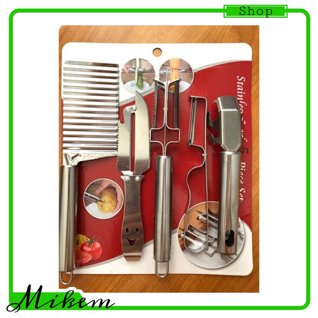 Nhà cửa & Đời sống > Dụng cụ nhà bếp > Bàn nạo, dụng cụ bào, cắt || Bộ 5 dụng cụ cắt sóng, bào, gọt rau củ quả siêu tiện lợi bằng inox. Bộ dụng cụ 5 chi tiết inox cắt gọtCòn hàng