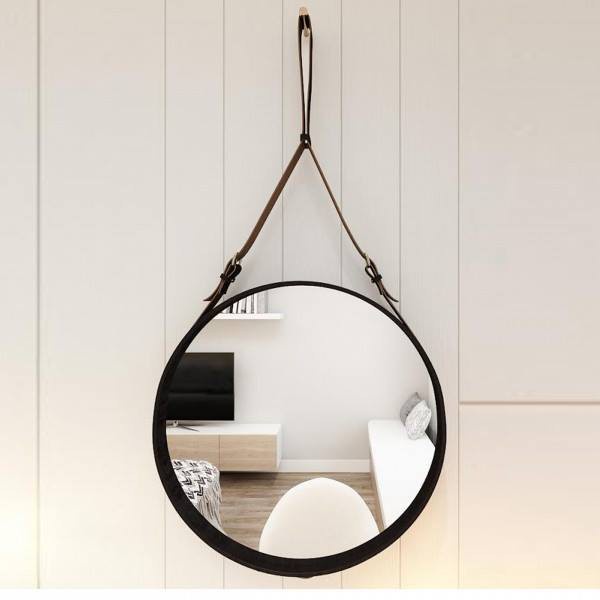 Trọn bộ sản phẩm bao gồm gương tròn treo tường, dây da và vít treo
