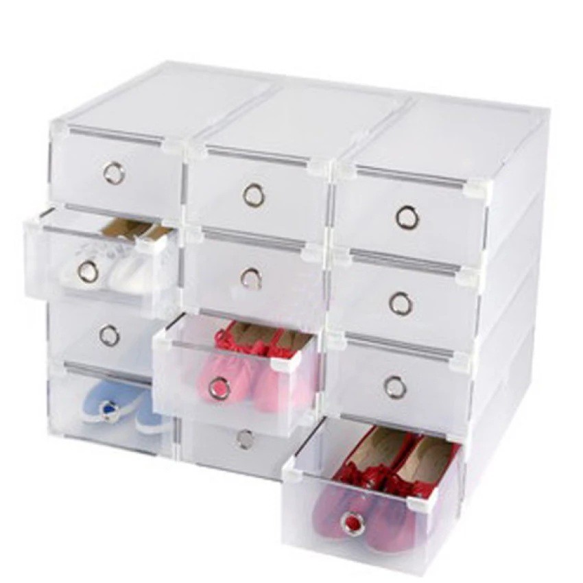 Hộp đựng giày ngăn kéo viền kim loạiCho bạn sắp xếp những đôi giày gọn gàng; sau đó có thể xếp lại lên kệ; giá để giày hoặc dưới sàn nhà một cách khoa học.