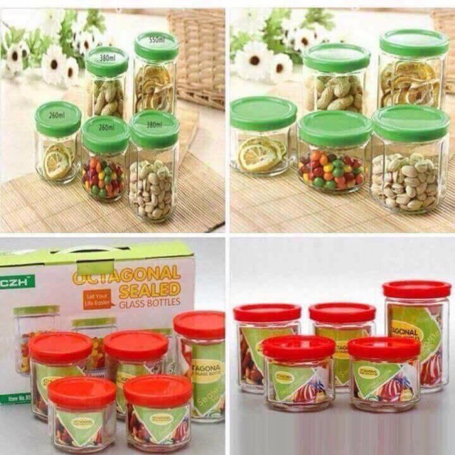 Combo gồm 5 lọ thuỷ tinh với 3 kích cỡ khác nhau, bạn sẽ đựng được tất cả các loại gia vị thường dùng trong căn bếp của mình như muối, hạt nêm, đường, tiêu, bột ngọt… Bạn cũng có thể sử dụng vào những mục đích khác nhau như đựng các loại đồ khô mứt, bánh kẹo, hạt dưa… trong những ngày lễ, Tết.