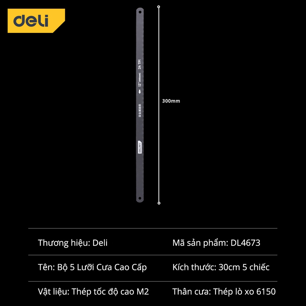 Nhà cửa & Đời sống > Dụng cụ & Thiết bị tiện ích > Dụng cụ > Cưa, máy cắt & máy mài || Bộ 5 Lưỡi Cưa Deli Cao Cấp Chính Hãng 12inch 24TPI Chất Lượng Cao - Siêu Bền, Sắc Bén, Chất Liệu Thép Không Gỉ - DL4673Còn hàng