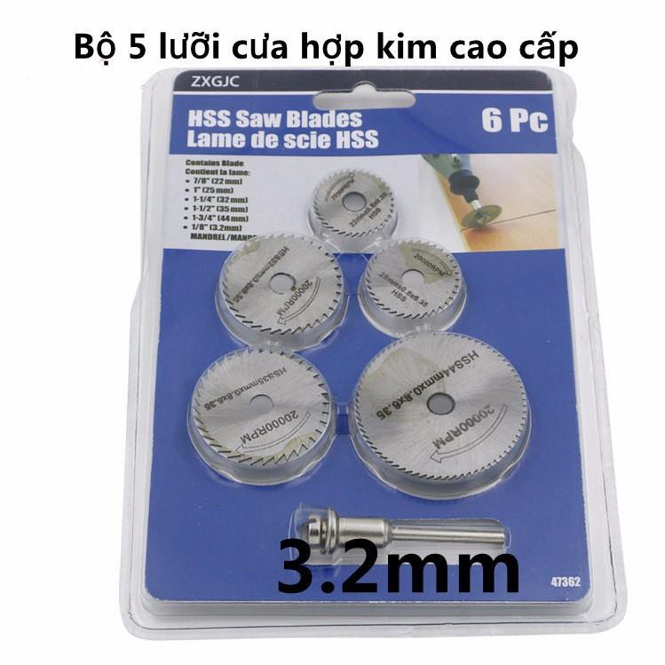 Bộ 5 lưỡi cưa hợp kim cao cấpBộ 5 lưỡi cưa hợp kim cao cấp: Lưỡi cưa hợp kim cao cấp dùng lắp vào máy khoan, mài , khắc…. để cắt nhựa, gỗ, nhôm…và các vật liệu mềm khác.