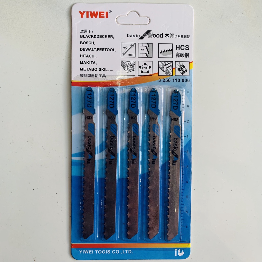 - YIWEI T127D: cắt gỗ mịn, cắt thẳng. Dài tổng 100mm, phần lưỡi cưa 75mm, khoảng răng 2mm, cắt dày 60mm