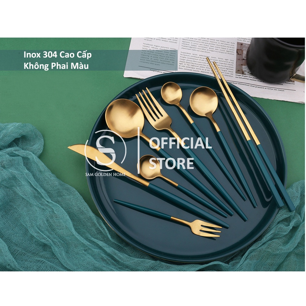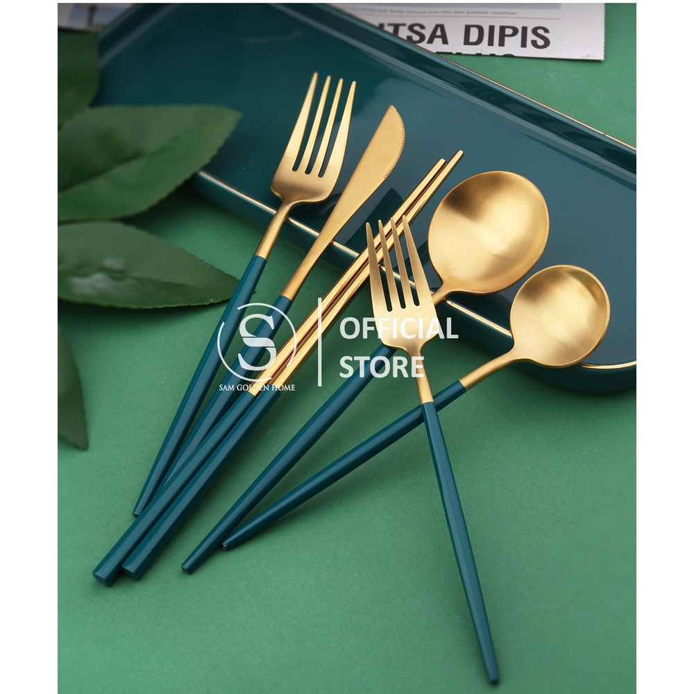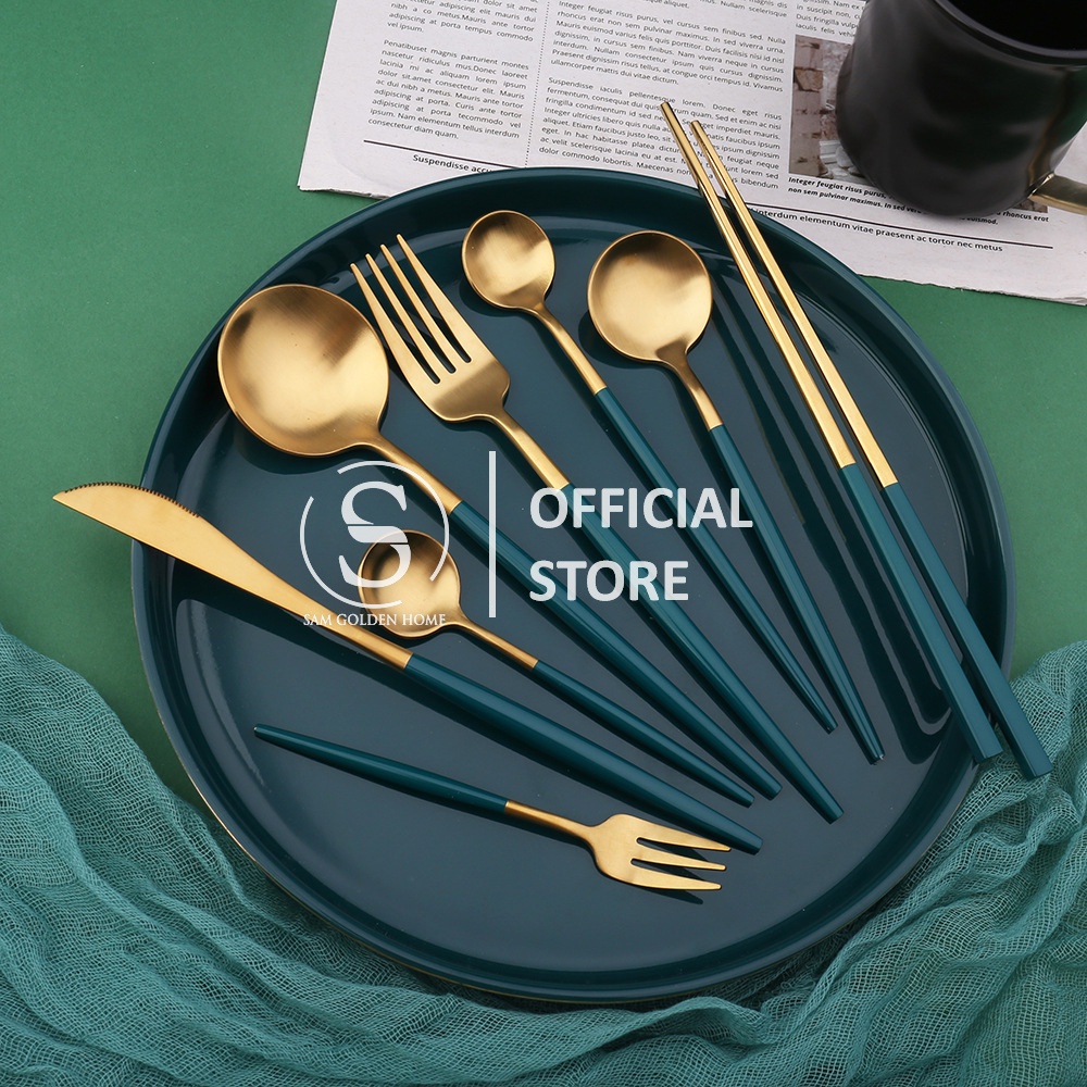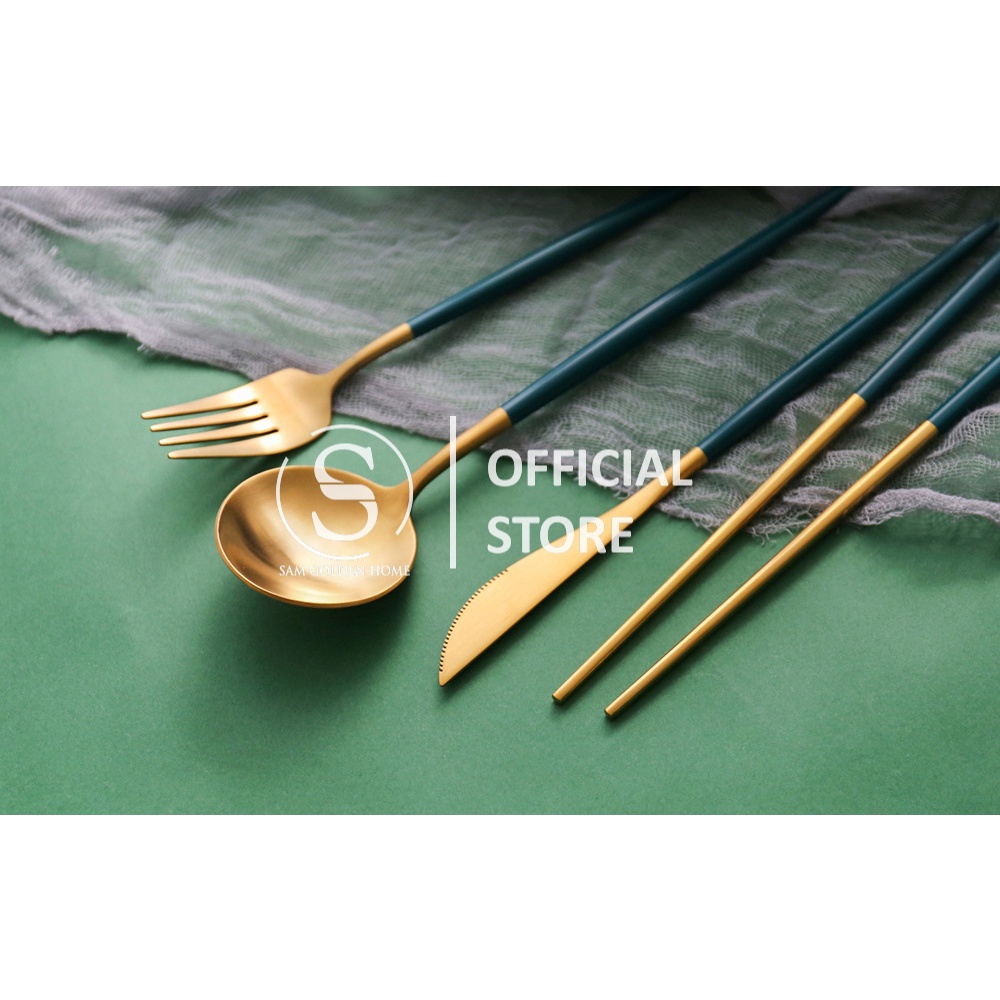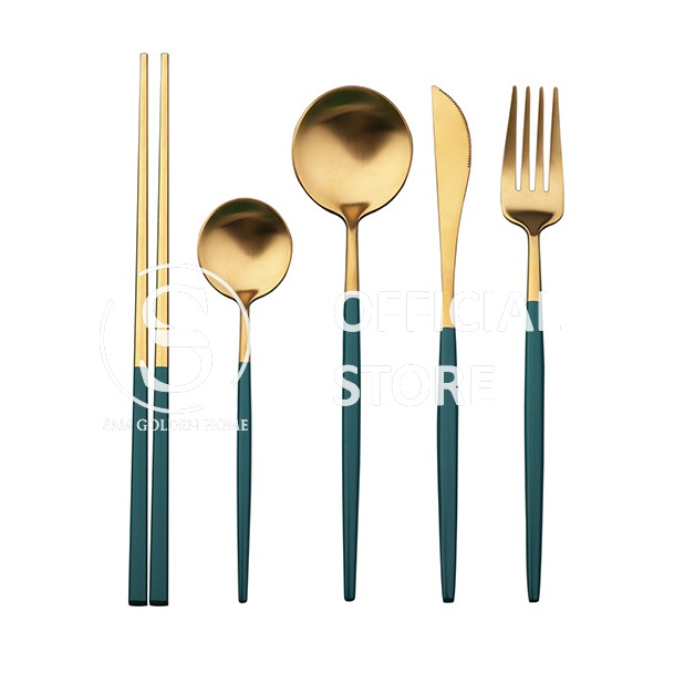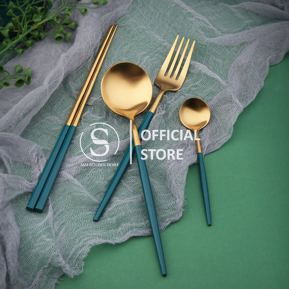 CỬA HÀNG NỘI THẤT CAO CẤP SAM GOLDEN HOME DECORSet 5 Món Muỗng Dao Đũa Nĩa Vàng Gold Xanh Lục Bảo Xanh Cổ Vịt Sang Trọng Trang Trí
