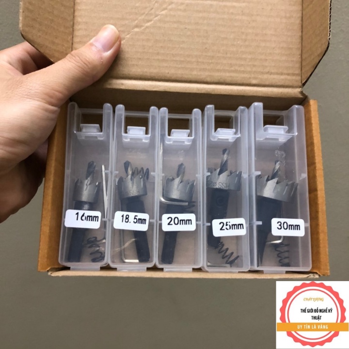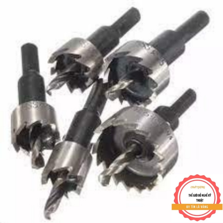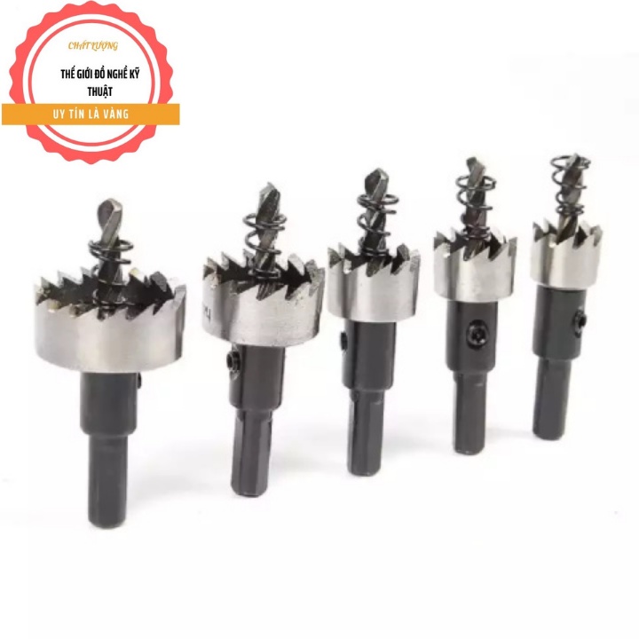 Bộ 5 mũi khoan khoét lỗ sắt nhôm nhựa hợp kim HSS 16-18,5-20-25-30mmBộ 5 mũi khoan khoét lỗ hợp kim HSS được cấu tạo bởi loại thép HSS cao cấp có độ đàn hồi cao chịu lực chịu nhiệt tốt có khả năng khoan trên nhiều chất liệu cứng như kim loại, đá, gỗ ...v.v. 5 mũi khoan với các cấp đường kính từ 16mm đến 30mm giúp bạn khoan tạo lỗ dễ dàng và nhanh chóng, được ứng dụng nhiều trong lĩnh vực điêu khắc, làm đồ thủ công mỹ nghệ và trong đời sống hàng ngày.