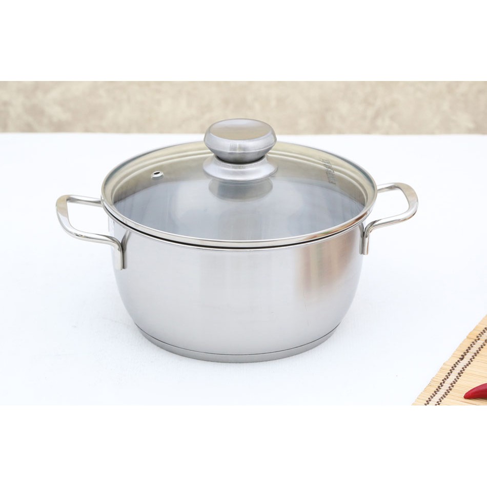 Bộ nồi 5 cái, quai đủa, 3 đáy, kiểu dáng châu Âu sang trọng, được làm bằng inox cao cấp từ Nhật Bản và Hàn Quốc. Kết cấu đáy nồi gồm 3 lớp: inox-nhôm-inox đảm bảo sự truyền nhiệt đều và giử nhiệt lâu nhằm tiết kiệm nhiên liệu, không làm thức ăn bị cháy sém hoặc chín không đều. Bộ nồi dùng được cho bếp than, bếp điện, bếp gas và bếp từ. Bộ nồi phù hợp với mọi gia đình.* Nồi 24 cm + nắp kính