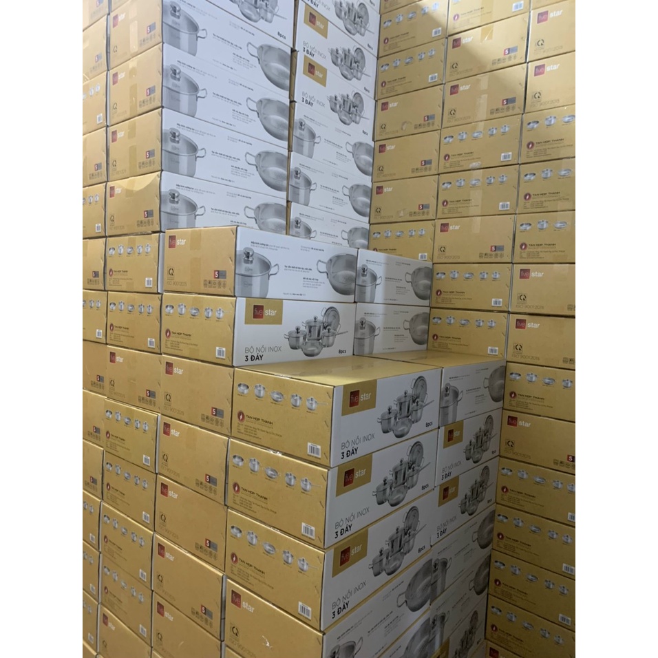 Bộ 5 nồi Inox 3 đáy Fivestar nắp kính chính hãng Tân Hợp Thành dùng bếp từ, bảo hành 5 nămBộ nồi 5 cái, quai đủa, 3 đáy, kiểu dáng châu Âu sang trọng, được làm bằng inox cao cấp từ Nhật Bản và Hàn Quốc. Kết cấu đáy nồi gồm 3 lớp: inox-nhôm-inox đảm bảo sự truyền nhiệt đều và giử nhiệt lâu nhằm tiết kiệm nhiên liệu, không làm thức ăn bị cháy sém hoặc chín không đều. Bộ nồi dùng được cho bếp than, bếp điện, bếp gas và bếp từ. Bộ nồi phù hợp với mọi gia đình.