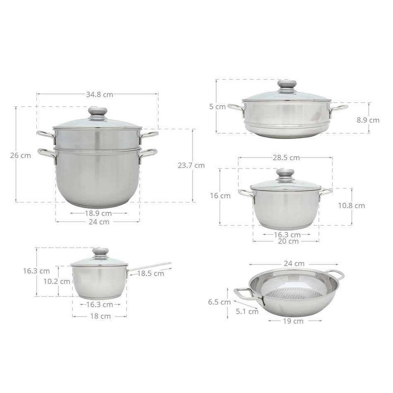 Bộ nồi gồm: 1 nồi: 24 x 14 cm; 1 nồi 20 x 10 cm và 1 nồi 18 x 10 cm; 1 chảo: 24 x 6.5 cm và 1 xửng 24 x 8 cm