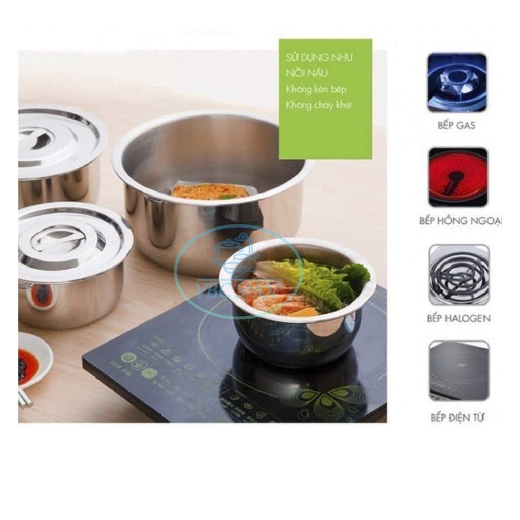 - Đặc biệt với bộ nồi inox 5 món không quai không kén bếp, dùng được trên bếp từ.
