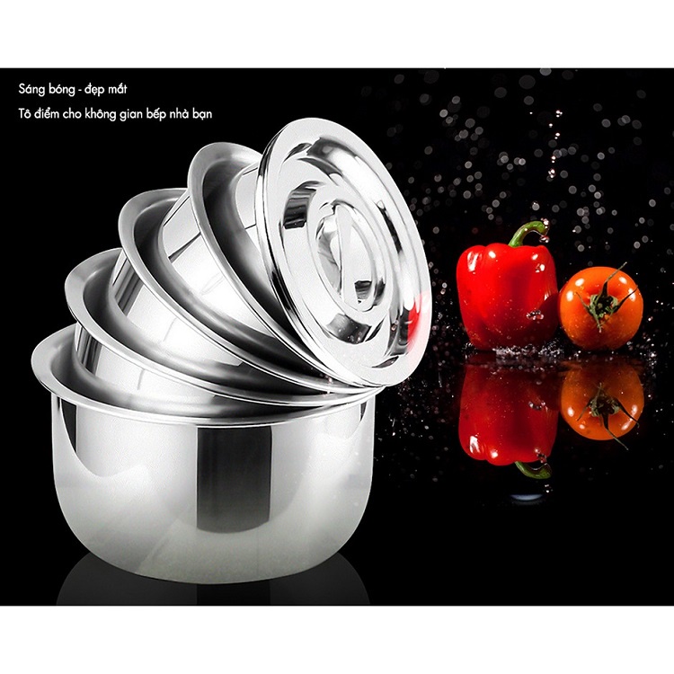 Thông Tin Về Sản Phẩm Bộ 5 nồi Inox 5 kích thước khác nhau, không quai cất dọn gọn gàng, dùng được cho tất cả các loại bếp