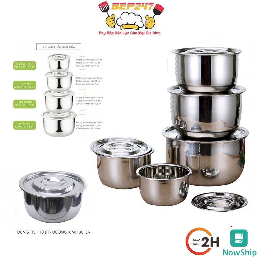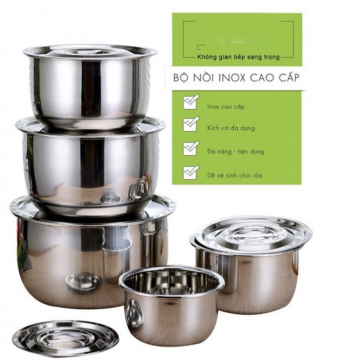 Nhà cửa & Đời sống > Dụng cụ nhà bếp > Nồi || Bộ 5 Nồi Inox, 5 Kích Thước Khác Nhau - Dùng Được Với Mọi Loại Bếp, Không Quai Cất Dọn Gọn GàngCòn hàng