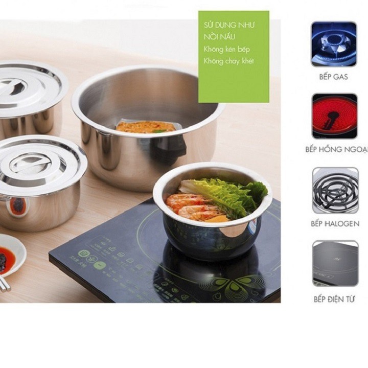 - Đặc biệt với bộ nồi inox 5 món không quai không kén bếp, dùng được trên bếp từ.