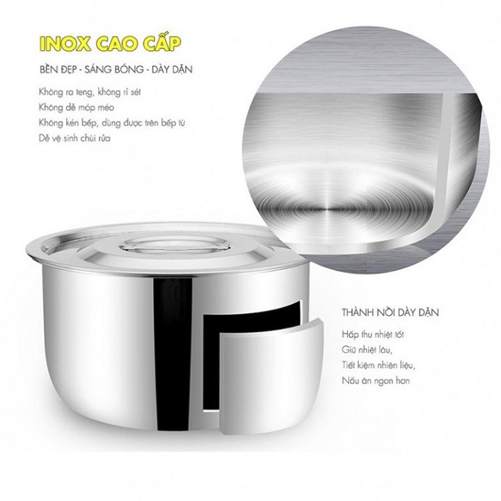 - Chất liệu inox cao cấp - Sản phẩm được làm từ chất liệu inox 410 cao cấp, không gỉ, chịu nhiệt tốt và không sản sinh chất độc hại ngay cả khi đun nấu ở nhiệt độ cao, an toàn cho sức khỏe. Với chất liệu inox nồi rất dễ vệ sinh, chùi rửa và giữ độ sáng bóng dài lâu.