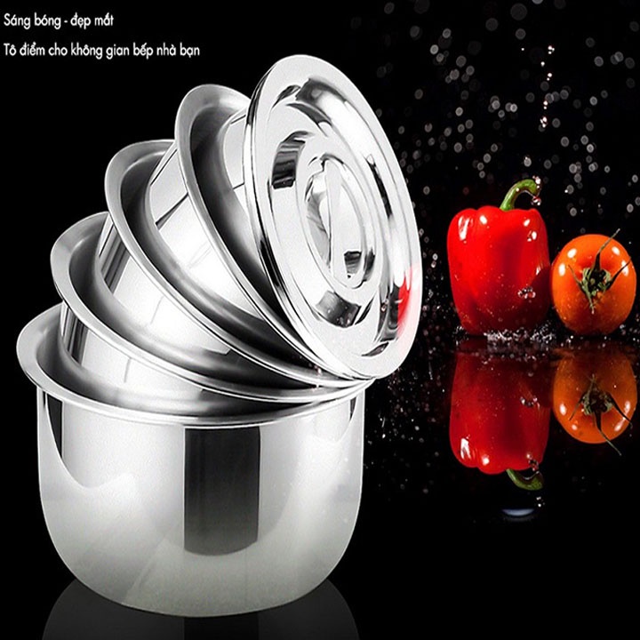 Nhà cửa & Đời sống > Dụng cụ nhà bếp > Nồi || Bộ 5 nồi Inox 5 kích thước khác nhau, không quai cất dọn gọn gàng, dùng được cho tất cả các loại bếpCòn hàng