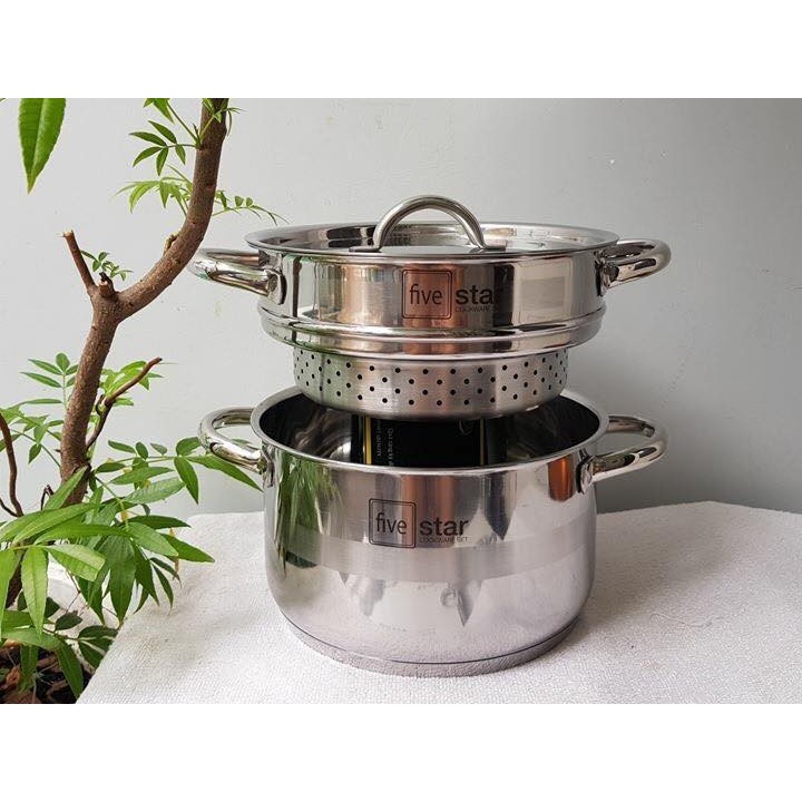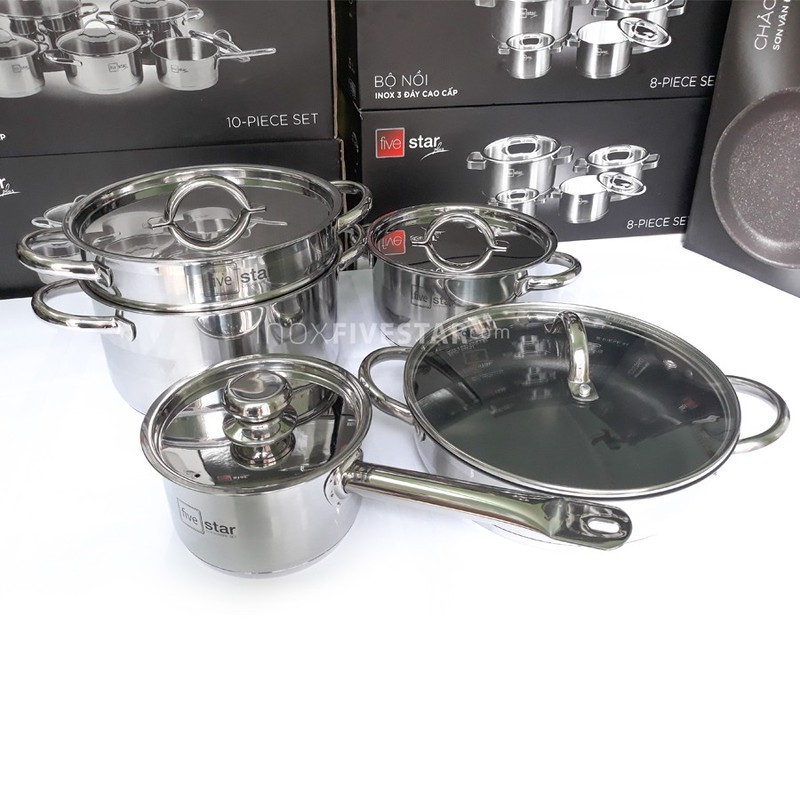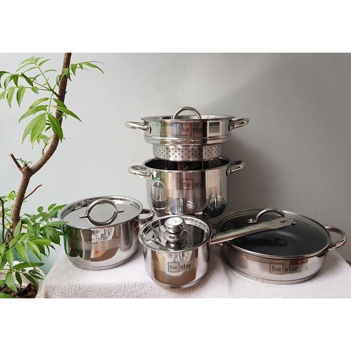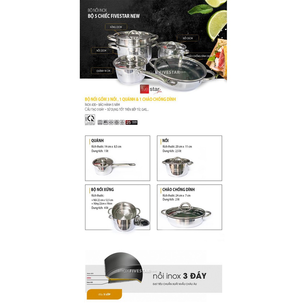 Theo xu hướng người tiêu dùng và lắng nghe ý kiến đóng góp nay Five Star cho ra bộ nồi inox five star 5 món mẩu mới đổi chảo inox thành chảo chống dính giúp các chị em có gia đình ít người chỉ cần mua 1 là có đủ các món, vừa có nồi vừa có xửng hấp có quánh và có cả chảo chống dính có nắp kính luôn.