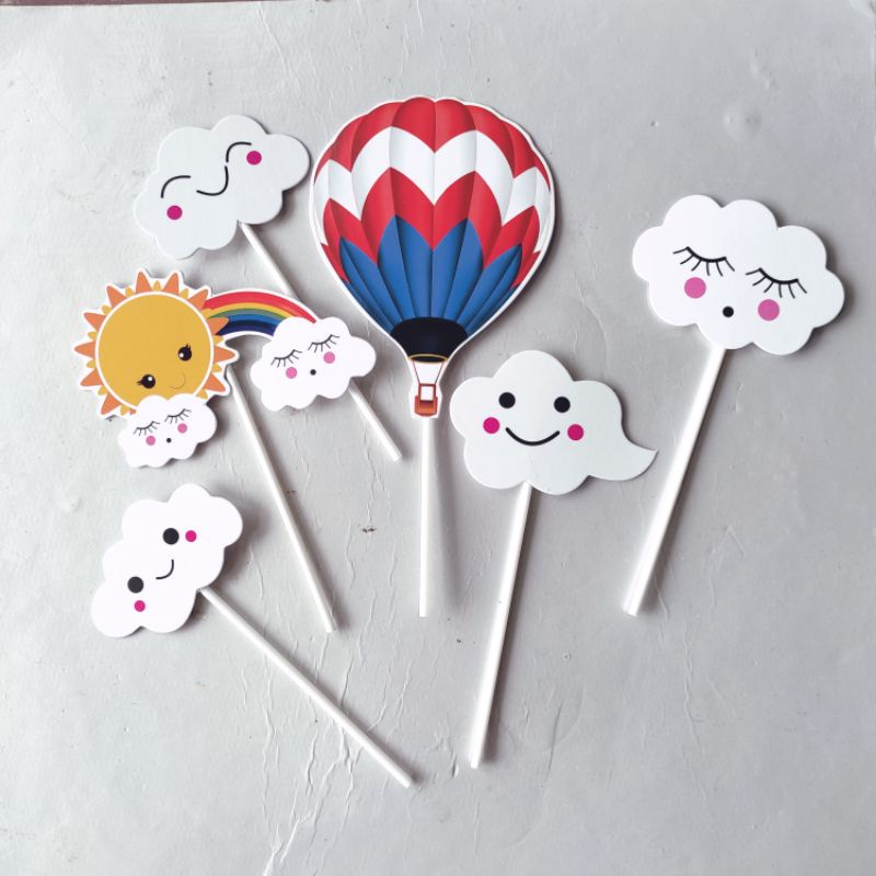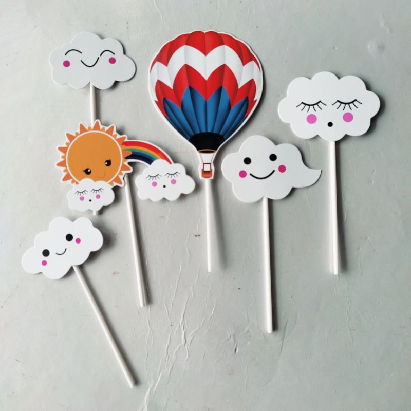 Bộ 5 que cắm hình đám mây khí cầu trang trí bánh kem, toppercake- Chất liệu: giấy in hình chuẩn sắc nét