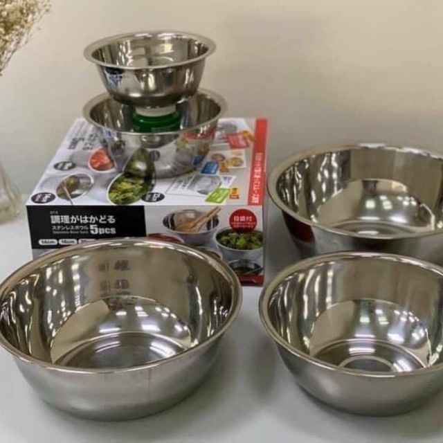 Nhà cửa & Đời sống > Dụng cụ nhà bếp > Dụng cụ đo lường || Bộ 5 Thau inox SUS 304 Không Gỉ Chất Liệu Dày Dặn Kích Thước Từ 14-24cm, Bộ Thau có vạch đo lườngCòn hàng