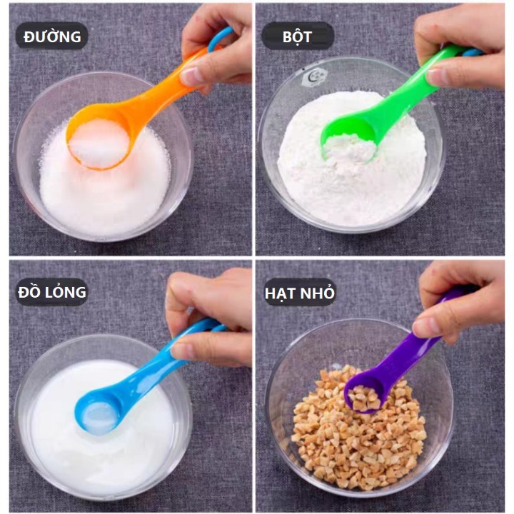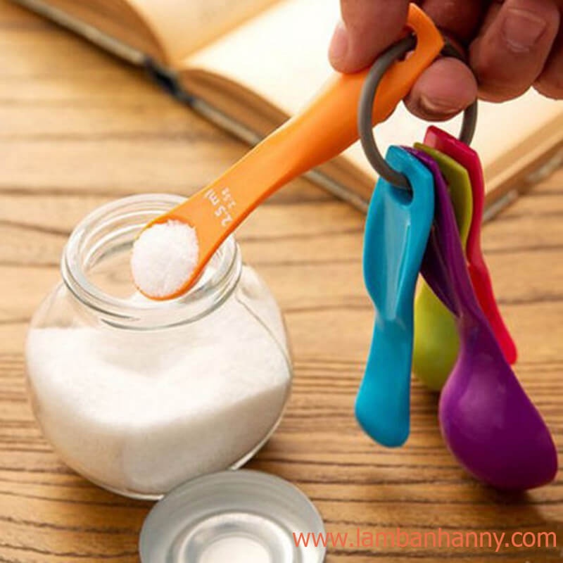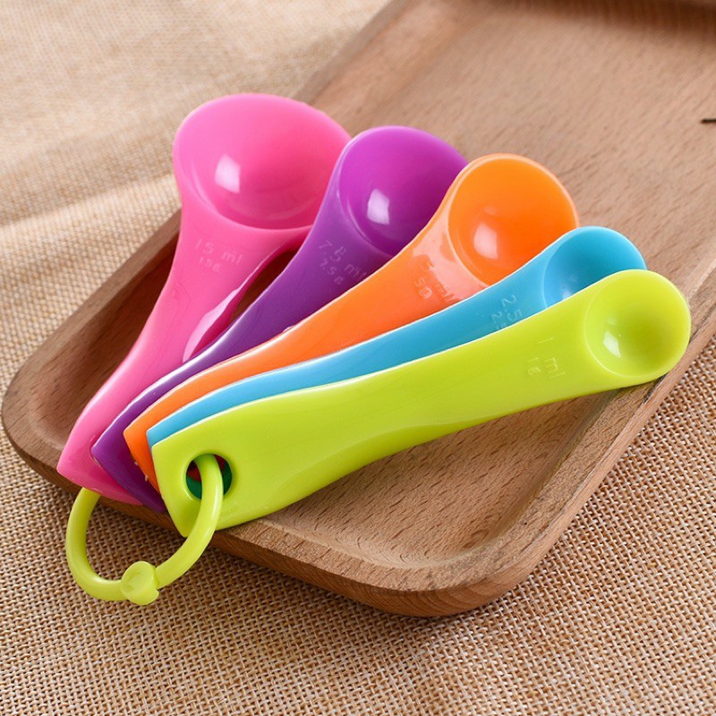 Bộ gồm 5 thìa đong với đầy đủ các sắc màu: tím, vàng, xanh lá, xanh dương, hồng đẹp mắt