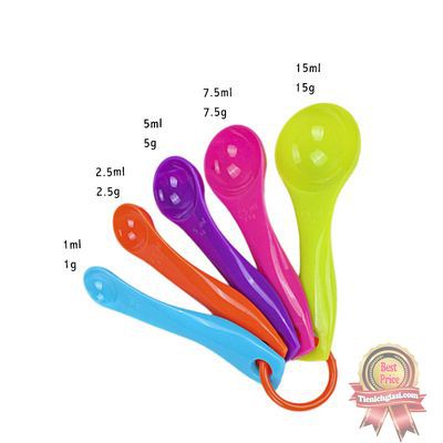 • 5 thìa đong được cả ml và gram tương ứng như sau: 1g / 2.5g / 5g / 7,5g / 15g tương ứng với 1ml/2.5ml/5ml/7.5ml/15ml